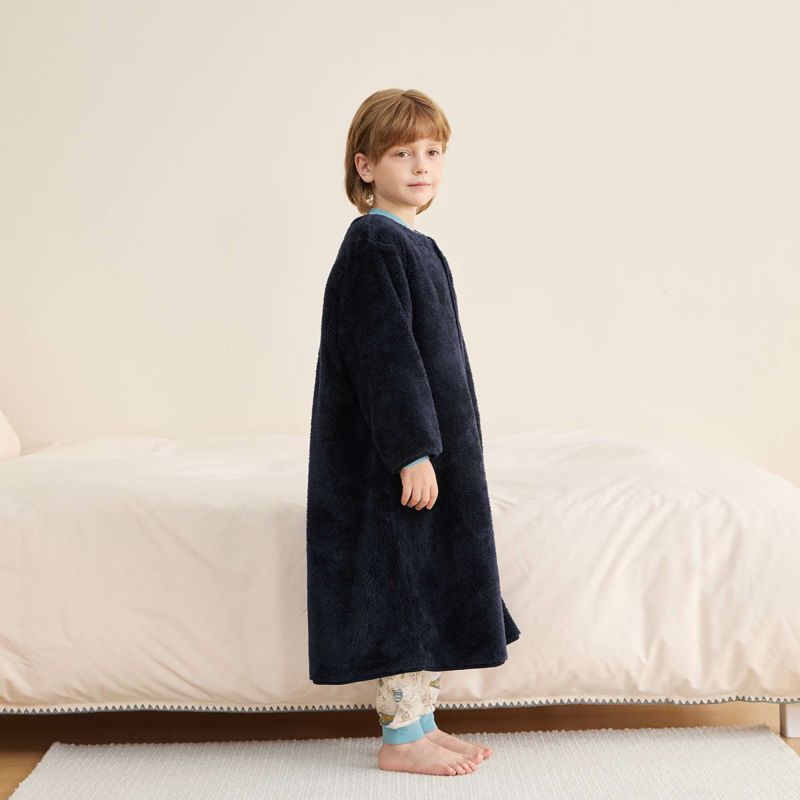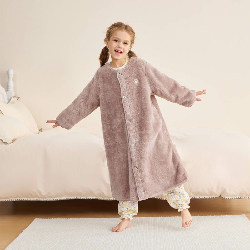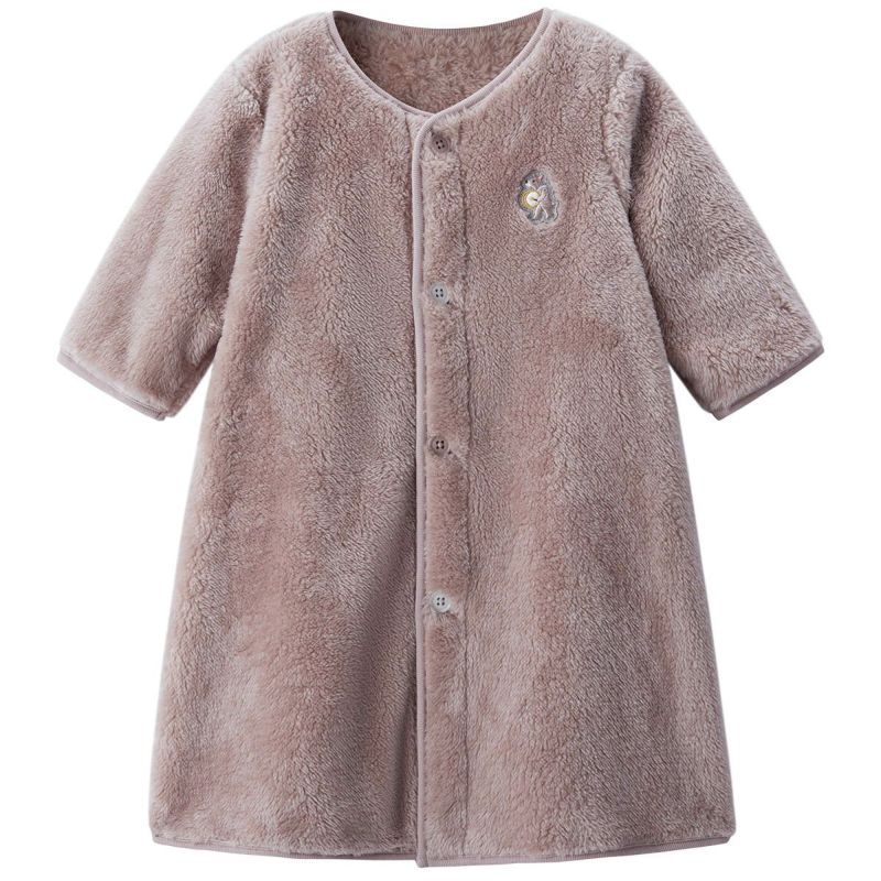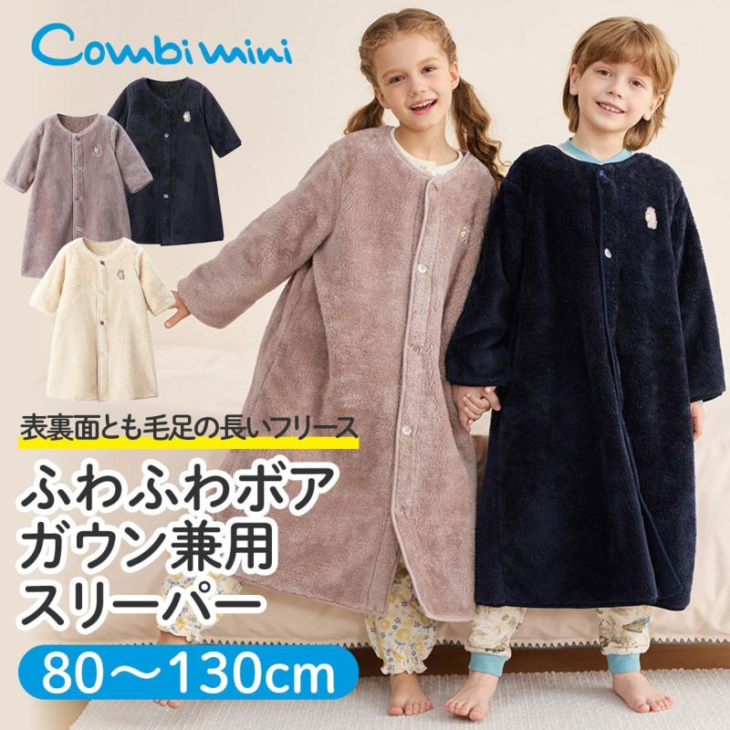【仕様】ボリュームたっぷりな、毛足の長い両面ボアフリースのスリーパーはガウンにもなって、とってもあったか。裾にはずり上がり防止ボタン付きでめくれを防止します。ボタンホールを斜めにしてボタンを留めやすくしました。