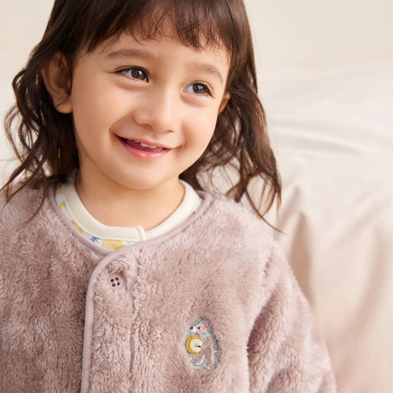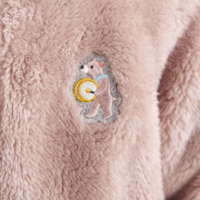 【素材】ボリュームたっぷりで、表面、裏面とも毛足の長いポリエステル100%のボアフリース。寒い季節にも重宝する軽くて温かい素材です。ボアフリースのシリーズでベビーからキッズまで幅広く展開しているので、リンクコーデを楽しむのもおすすめ。