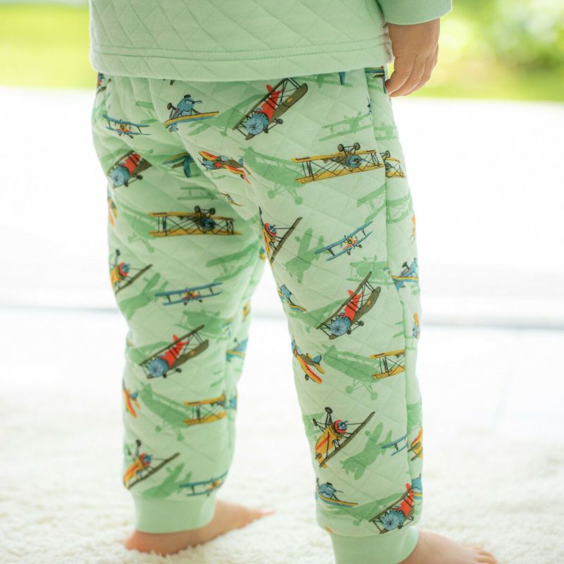 ヴィンテージ風の飛行機をリアルなタッチで表現した、やわらかくてあたたかいニットキルトパジャマです。きれいなライトグリーンを基調に、機体の影や白煙の軌道など躍動感のあるデザインがかっこいい。肌に触れるキルトの両面は綿100%で肌触りよく、間にふんわりした中綿をはさんであたたかさをキープ。おなかをしっかりカバーするシームレス腹巻付きで寝冷えから守ります。お着替えがスムーズに出来る被りタイプです。※ボトムは洗濯後、ウエストリブの形状を保つために形を整えて平干しで乾かしてください。