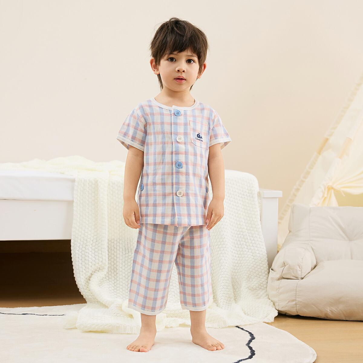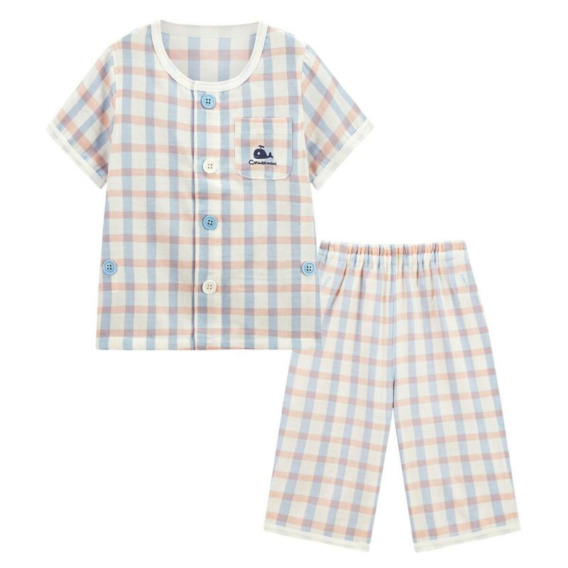 おなか安心ボタン付き半袖前開きガーゼパジャマ(先染めマリンチェック)