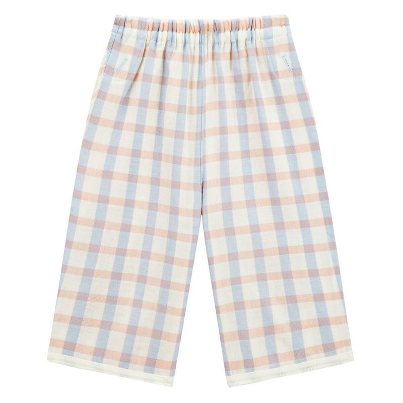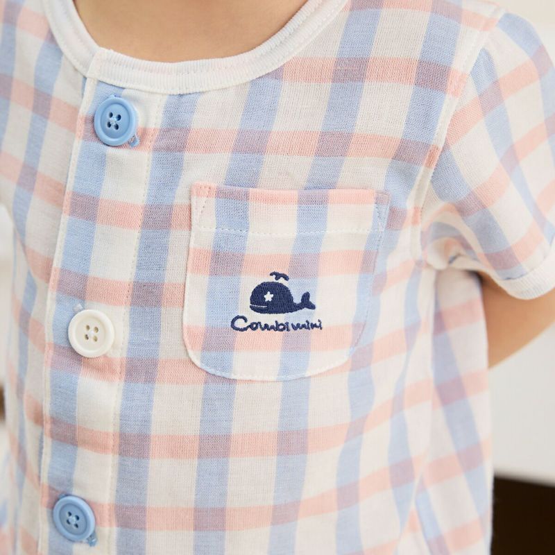 【柄】春らしくピンクとブルーが重なり合った優しい印象の、コンビミニ定番の先染めマリンチェック柄。ユニセックス向けのさわやかな色合いなので、男の子女の子とも着用できます。同素材同柄で長袖丈もご用意いたしました。用途シーズンに合わせてお選びくださいませ。(長袖品番656256)