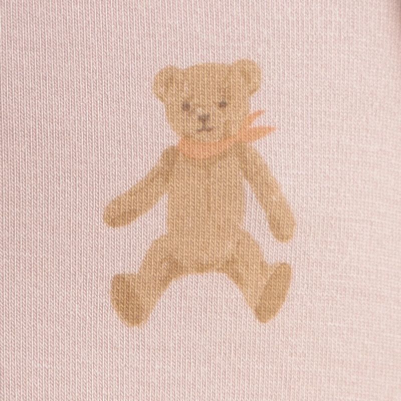 【仕様】女児に人気のあるライトピンクとラベンダーの2色をご用意しました。前身頃にはピコをあしらい、胸部分には定番テディベアのワンポイントプリントが施されています。Tシャツやトレーナーの下に着てもゴワつかない設計です。