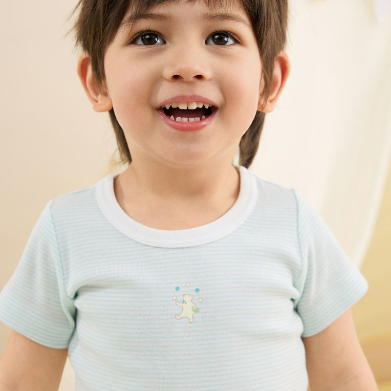 【柄】ユニセックスカラーで、こだわりの先染め極細ボーダーが特徴です。胸元にはお手玉クマさんのワンポイントモチーフが印象的な一枚です。