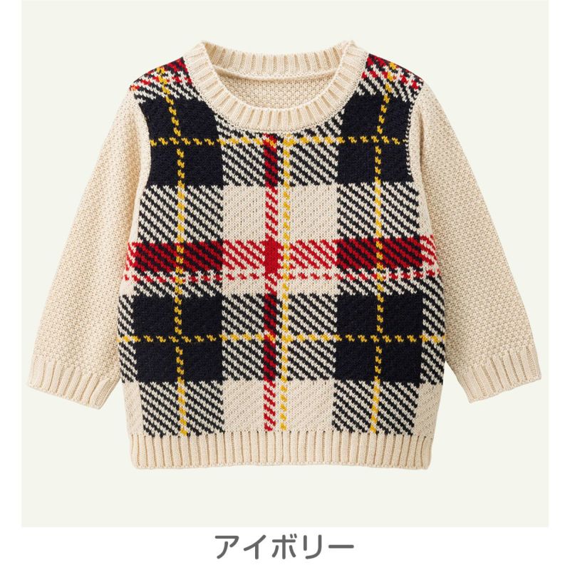 肌触りがよくチクチクしにくいアクリル糸を使った、軽くやわらかなニットです。しっかりと編み込まれた弾力のある風合いであたたか。前身頃の大胆なチェック柄が暗くなりがちな冬コーデを明るくおしゃれにアレンジしてくれます。肩開きなしの被りタイプなのでお着替えがスムーズに出来るのも嬉しい。家庭洗濯機で洗えます。※取り扱いの詳細については、商品についている品質表示でご確認ください。