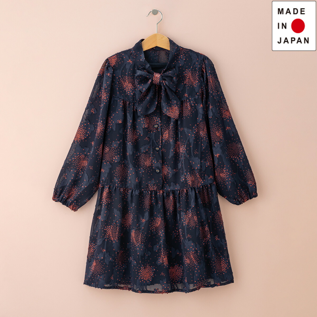 透け感のあるエレガントなレディ気分のボウタイ付きシフォンワンピース。花柄カットジャカードに小花プリントをのせた日本製生地は、熟練した技術を必要とする高級素材です。おでかけやフォーマルシーンにおすすめ。肌触りのよいソフトな綿100%のインナー付きです。
