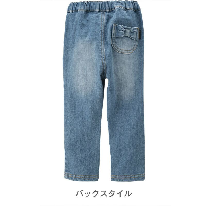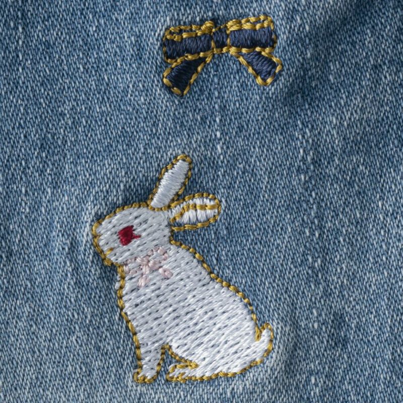 ダメージ加工をほどこした、カッコかわいくて、おしゃれなデニムパンツです。前ポケットのまわりにはリボンとうさぎの刺しゅう入りで、後ろポケットにはリボン風飾り付けと、ガーリーエッセンスもたっぷり盛り込みました。ストレッチ入りなので動きもラクラクです。
