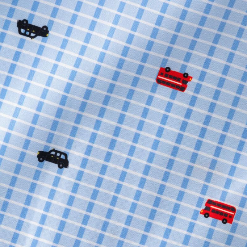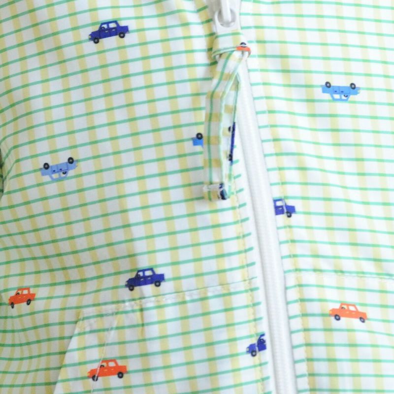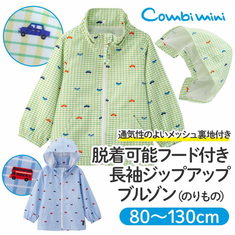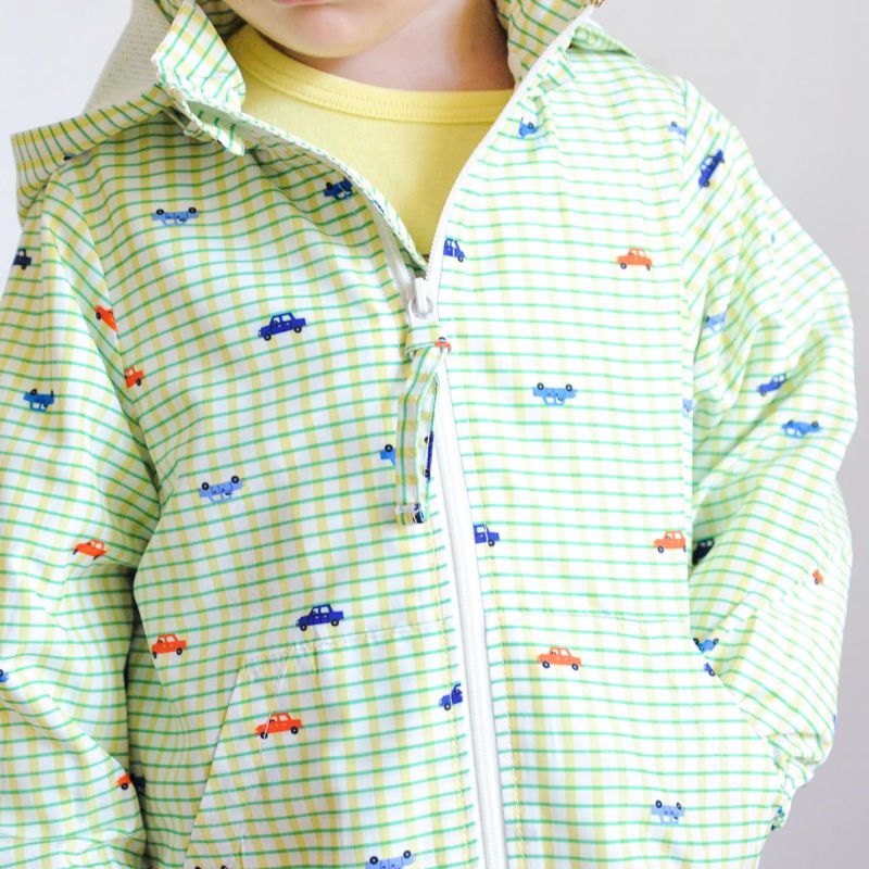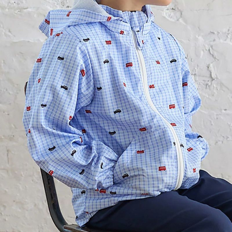 しなやかな軽量ポリエステルタフタのジップアップブルゾン。イエローグリーンはチェック×車、サックスはチェック×バス&タクシーをプリントしました。軽くて動きやすく、寒暖差のある春先に1枚あると重宝します。裏地は総メッシュで通気性がよく、フードはスナップボタンで取り外しができるので通園着にもおすすめです。