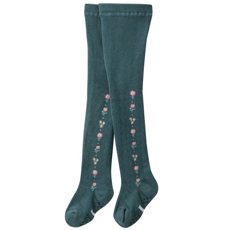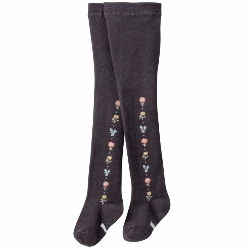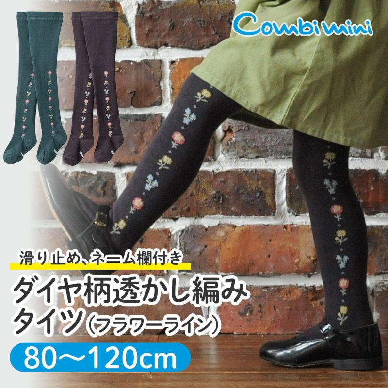 ダイヤ柄の透かし編みがキュートなタイツ。サイドにあしらった、色とりどりの花模様ラインがおしゃれなポイント。渋めのベースカラーで、かわいいけれど甘くなりすぎないクラシカルなコーデを演出できます。