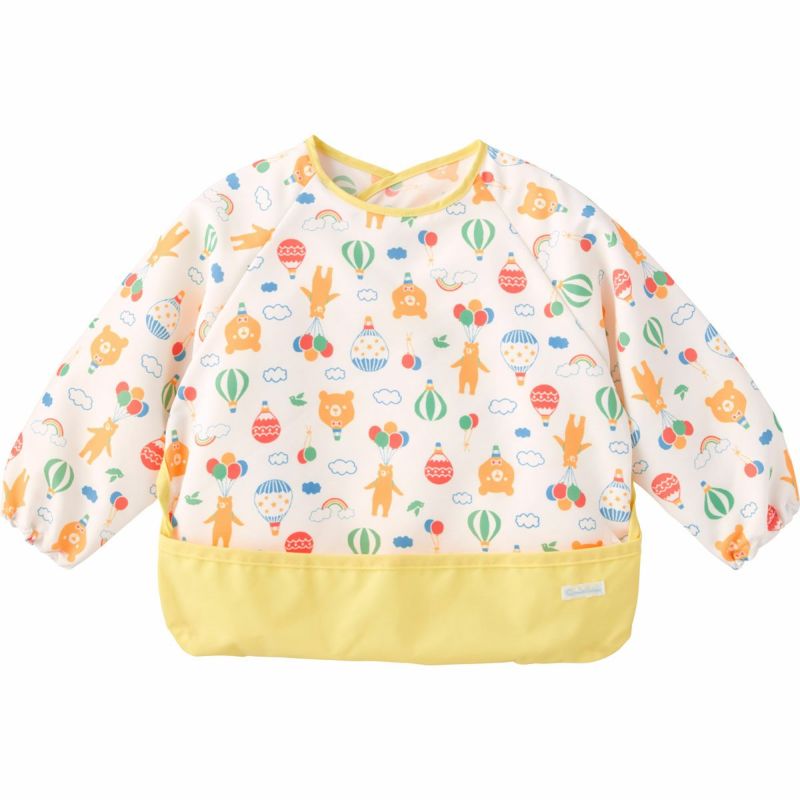 淡いレモン色をベースにパステルカラーのクマや気球が描かれた、かわいらしいエプロン。袖まですっぽりカバーする長袖で、食べこぼしをしっかりキャッチ。食事だけでなくお洋服を汚したくないシーンでも活躍します。