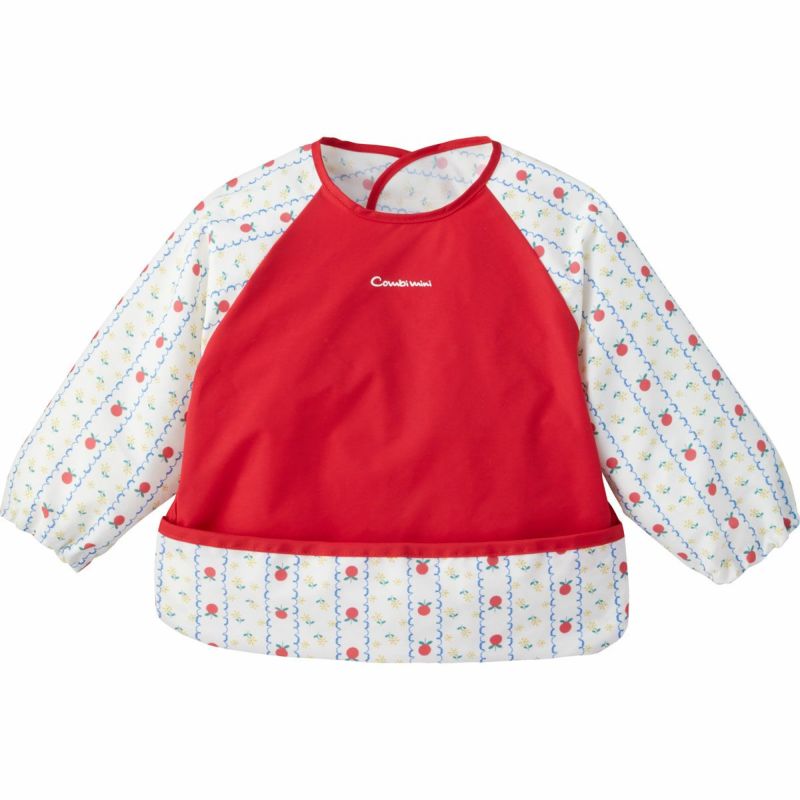りんごとお花をストライプに配した女の子におすすめのエプロン。ウエアを袖まですっぽりカバーする長袖エプロン。ワンタッチテープで脱着もかんたん。お食事はもちろん、洋服を汚したくないシーンで幅広く使えます。