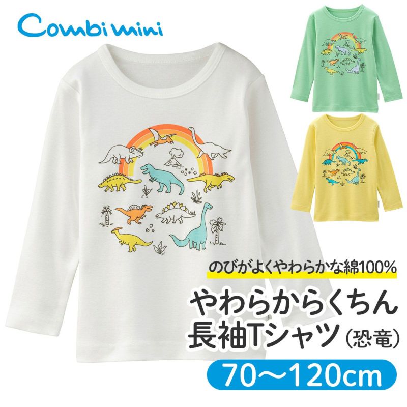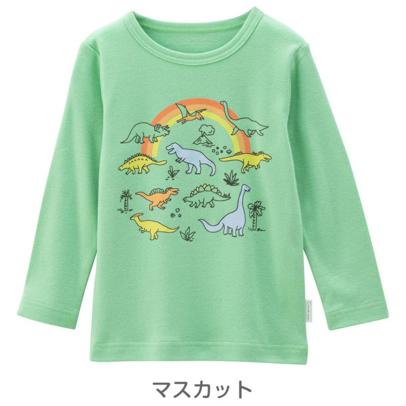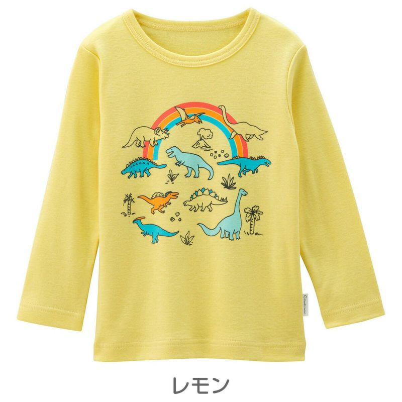 のびがよくやわらかな、綿100%フライス素材の長袖らくちんTシャツです。春を感じるオフホワイトや明るいビタミンカラーに、キッズが大好きな恐竜たちとレインボーをプリントしました。着るだけでパワーがでそうな、元気印のトップスです。肩開きなしでお着替えカンタン。