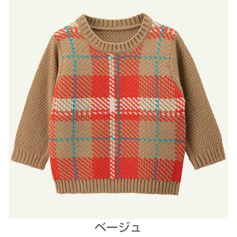肌触りがよくチクチクしにくいアクリル糸を使った、軽くやわらかなニットです。しっかりと編み込まれた弾力のある風合いであたたか。前身頃の大胆なチェック柄が暗くなりがちな冬コーデを明るくおしゃれにアレンジしてくれます。肩開きなしの被りタイプなのでお着替えがスムーズに出来るのも嬉しい。家庭洗濯機で洗えます。※取り扱いの詳細については、商品についている品質表示でご確認ください。
