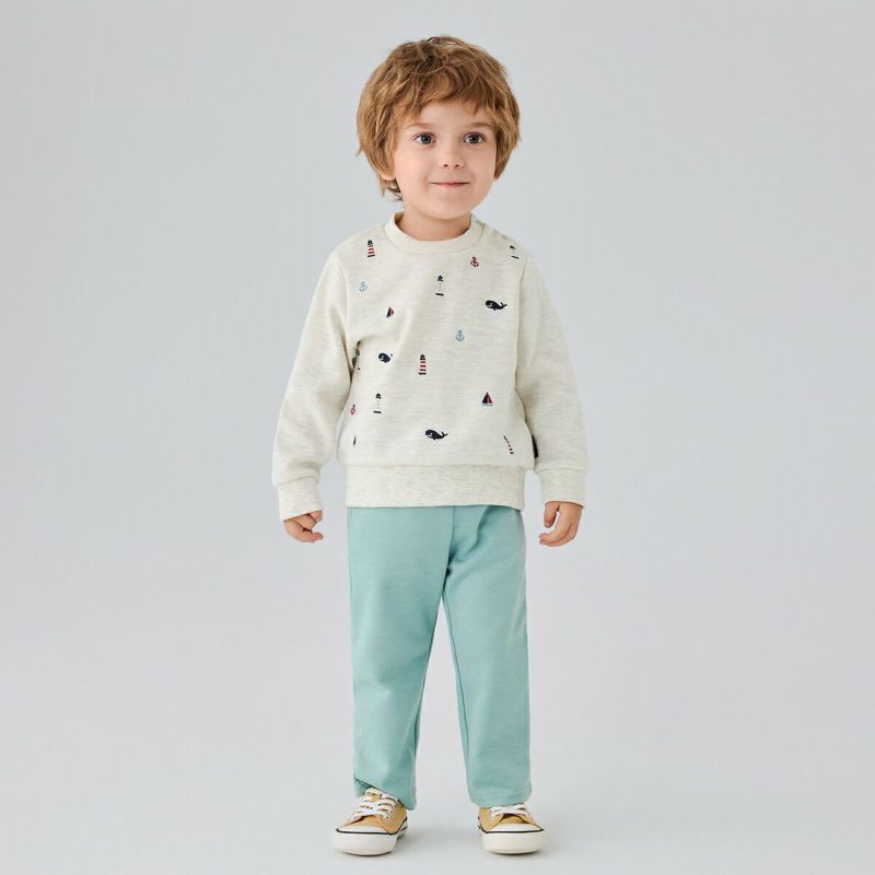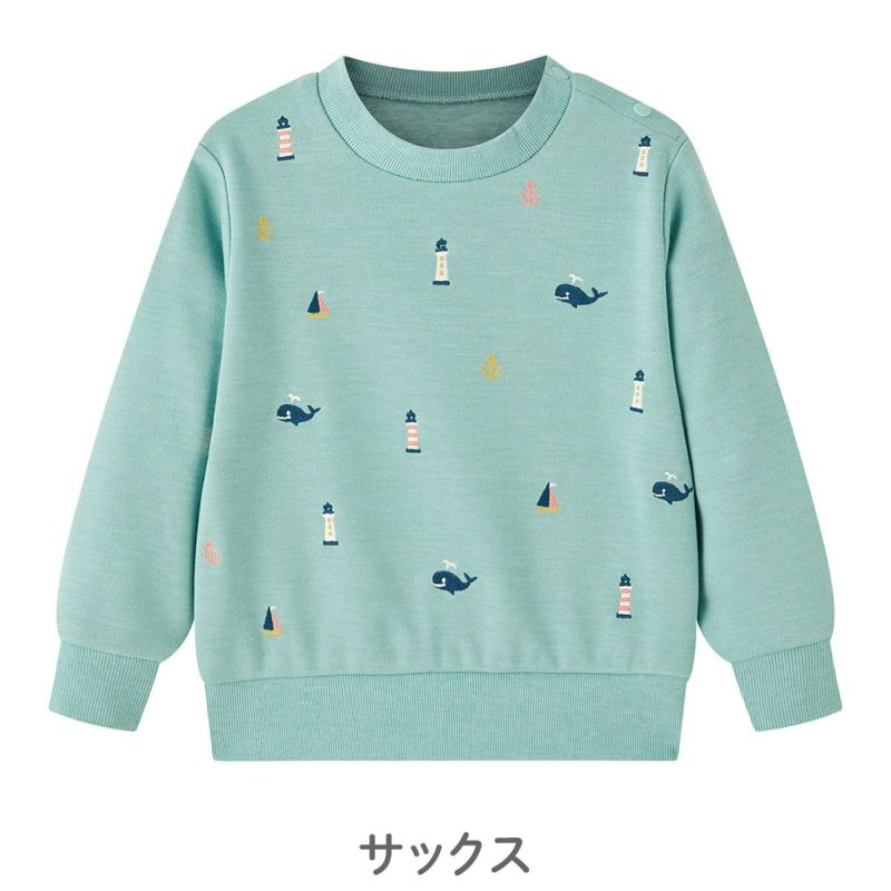 【柄】前身頃に灯台やクジラ等のマリンモチーフの総柄刺繍を入れました。1つ1つが特徴的でかわいらしい刺繍になっています。