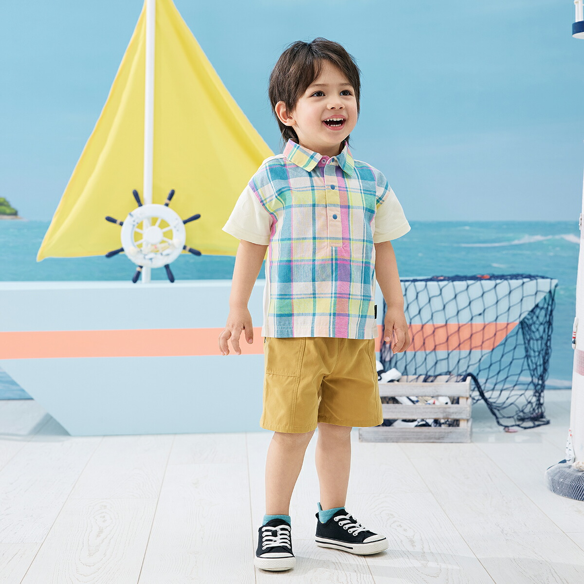 【素材】コンビミニ、オリジナルの先染めマドラスチェック柄は、さらっとした綿100%素材です。