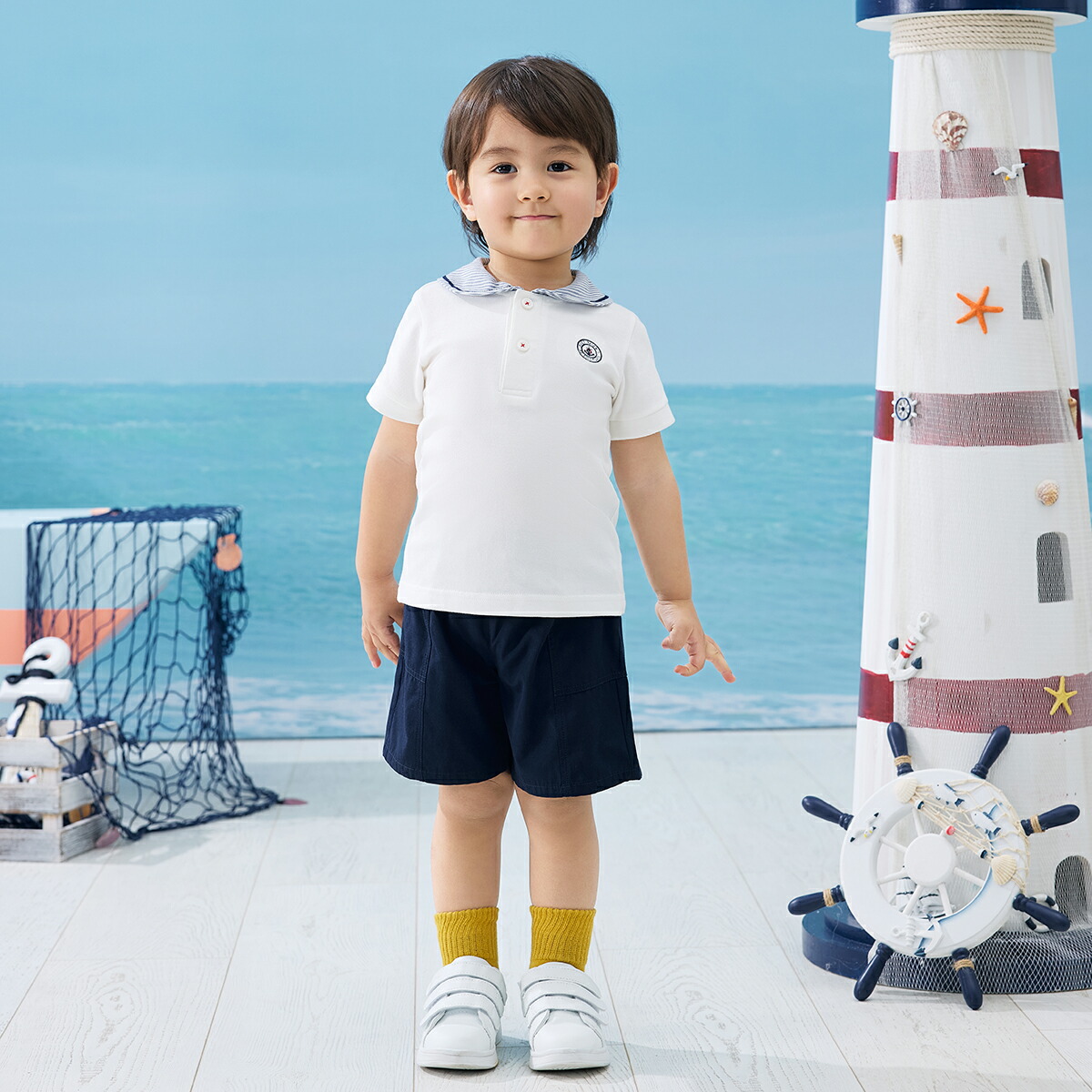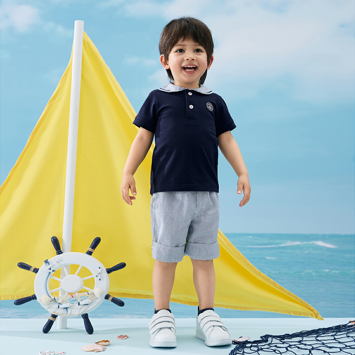 【仕様】衿にはアクセントでグログランテープを付け、ボタン付け糸は赤色の配色糸を使用し、細かいところまで気を配りました。この一枚で夏のマリンスタイルが完成する、衿付きのプルオーバータイプのシャツです。ボタン付きで脱ぎ着もしやすい仕様にしました。