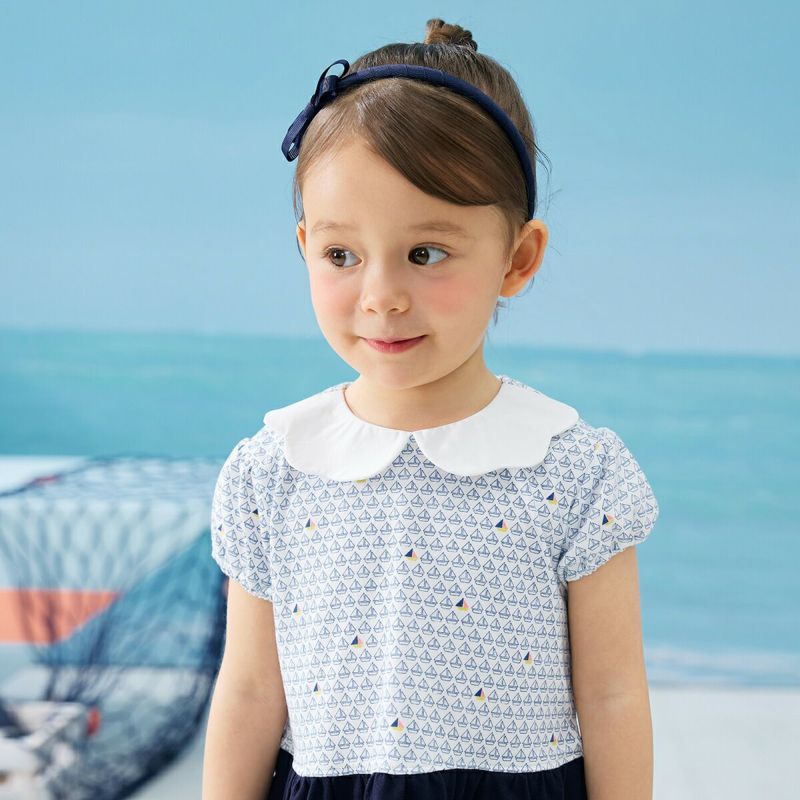 【柄】マリンテイストの小さいヨットの総柄に、アクセントで入れたピンクやイエロー、ブルーの差し色が華やかさを演出。スカート部分を表情のある無地カノコ素材で切り替えることで、大人っぽい印象に仕上げました。
