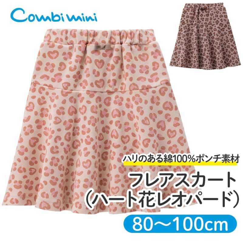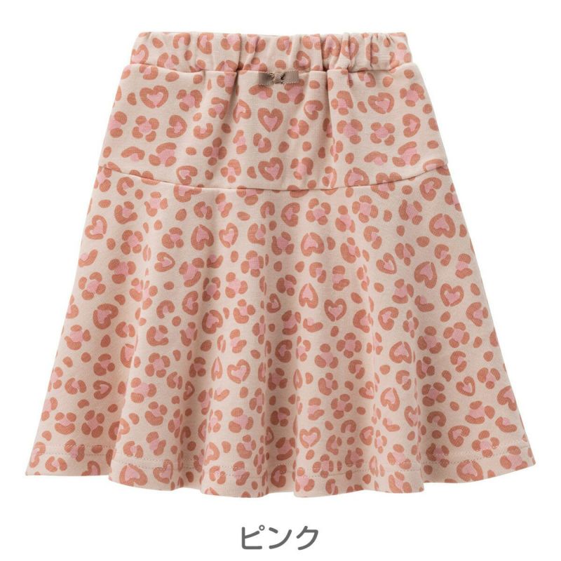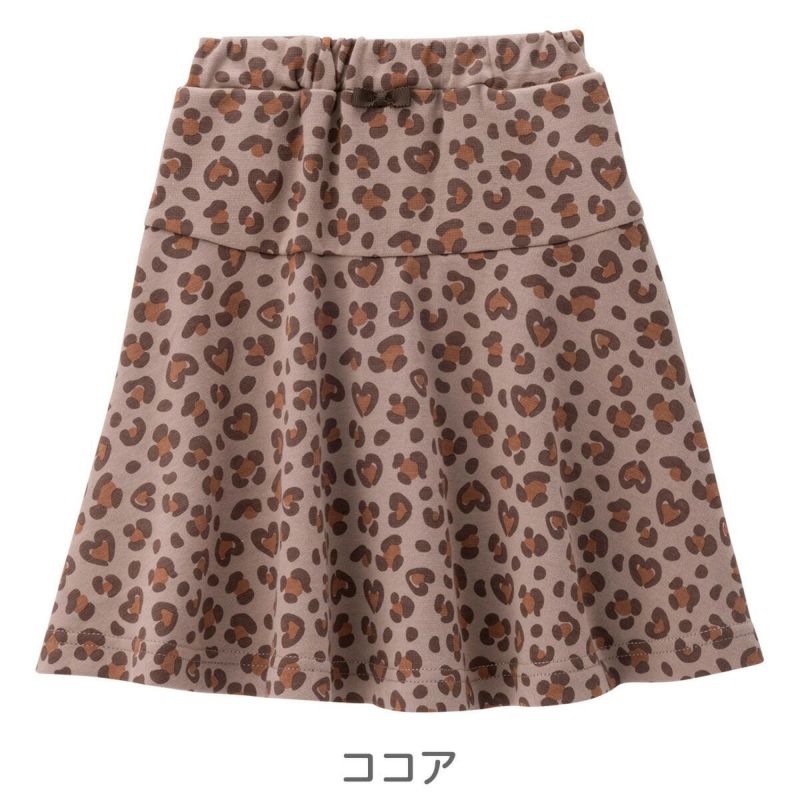ハリのある綿100%ポンチの素材感を生かした、フレアスカート。トレンド感のあるハートの花レオパード柄なので、シンプルなトップスと合わせてもメリハリのある着こなしに。ひざが隠れるくらいの丈で、前後が分かるリボン付き。ベビーとリンクコーデも楽しめます。