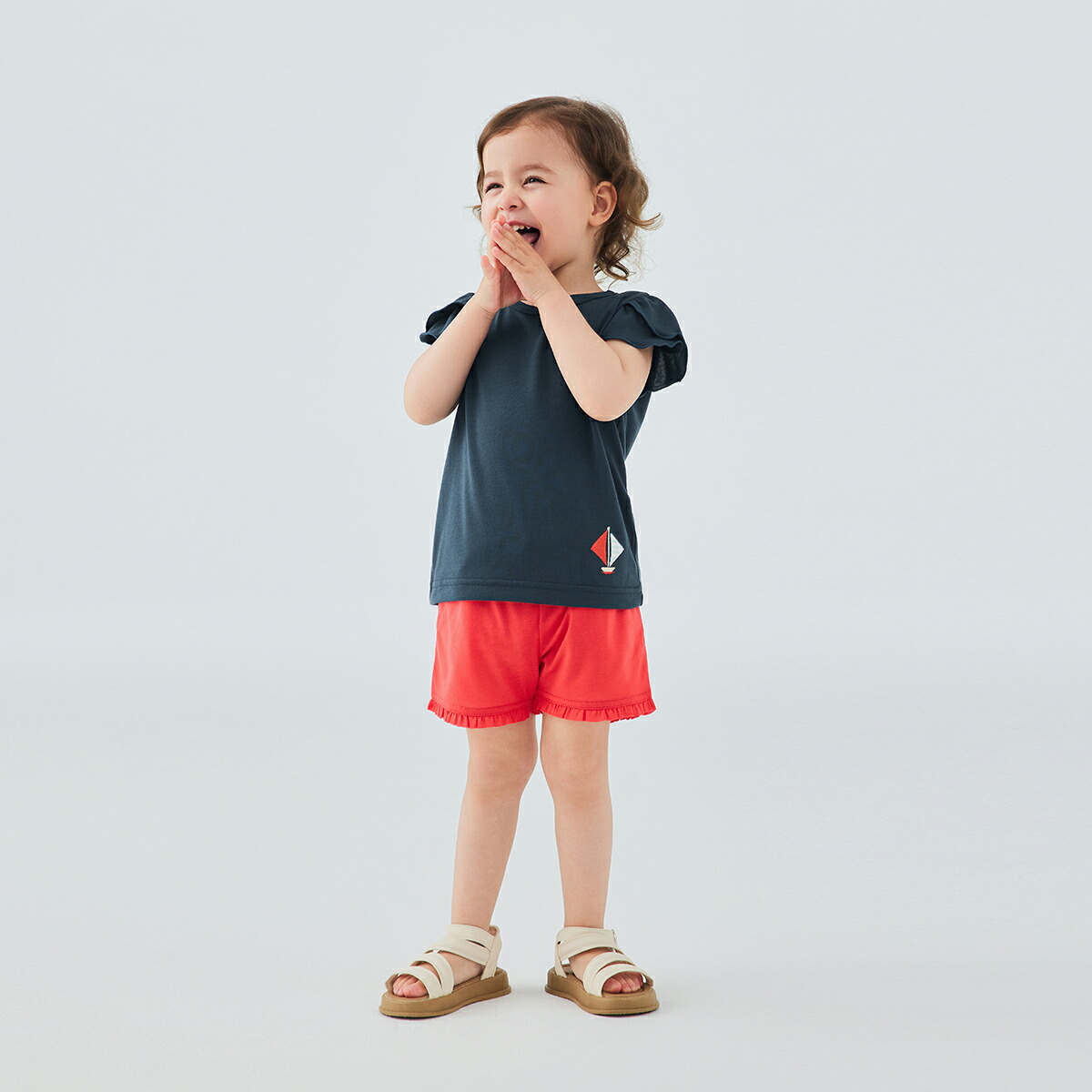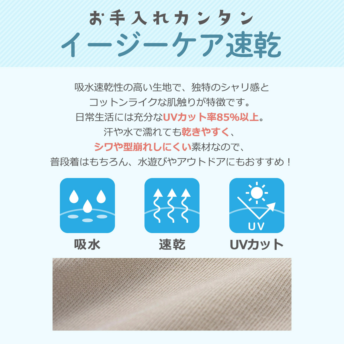 スポーティなショートパンツを、フリルとリボンでガーリーにアレンジした、この季節にぴったりな一着です。吸水速乾性の高いポリエステル100%の天竺生地で、独特のシャリ感とコットンライクな肌触りがポイント。日常生活には充分なUVカット率85%以上です。汗をかいたり水に濡れても乾きやすく、シワや型崩れしにくいイージーケア素材なので、タウンはもちろん、水遊びやアウトドアにもおすすめです。