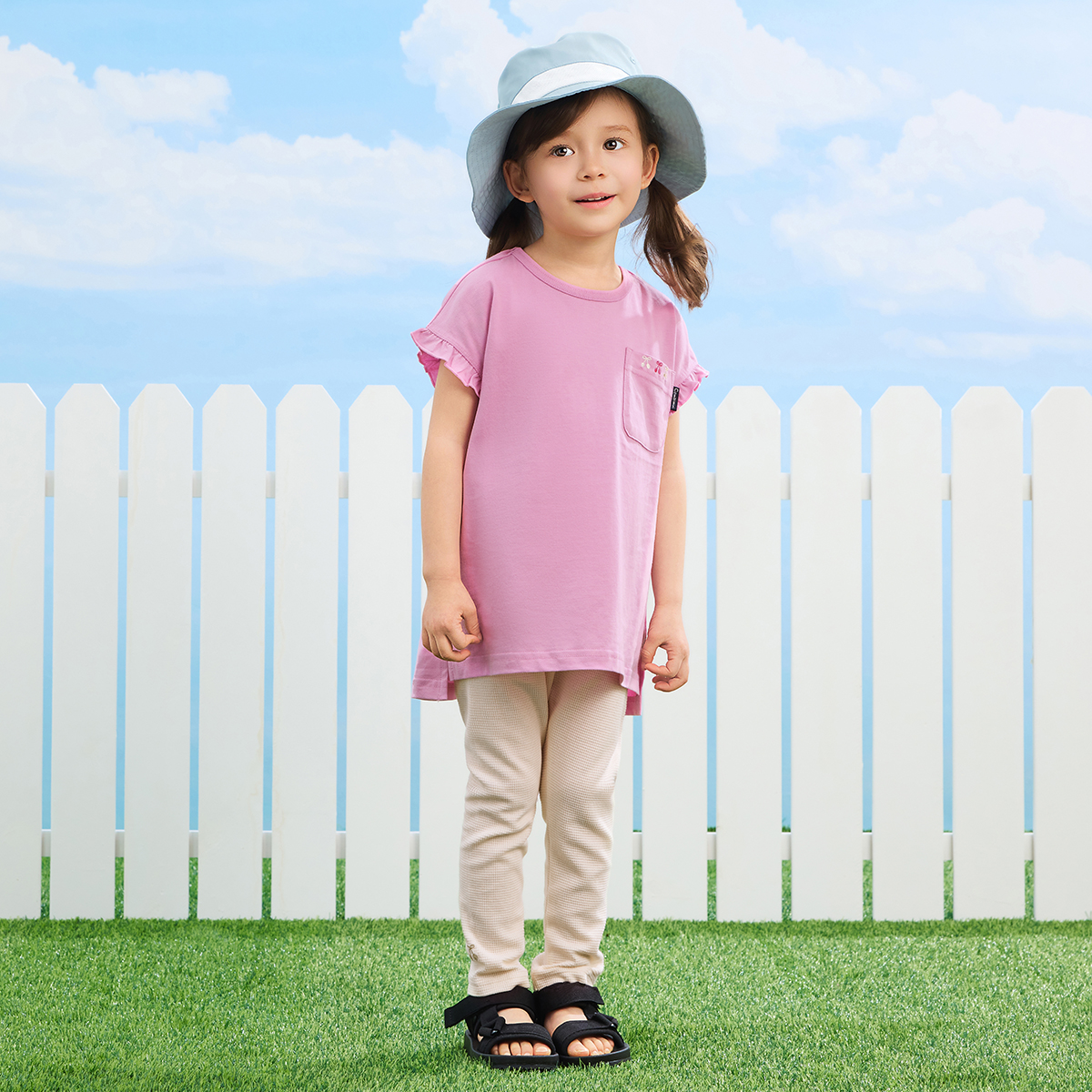 【素材】凹凸感があり通気性、吸水性がよく軽やかなストレッチワッフル素材です。ストレッチが効いているので運動量の多い子供にもおススメの素材です。外遊び対策でうれしい紫外線カット効果もあり(紫外線遮蔽率:93%。アイボリーカラーで試験実施)