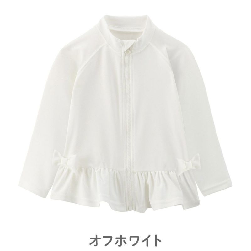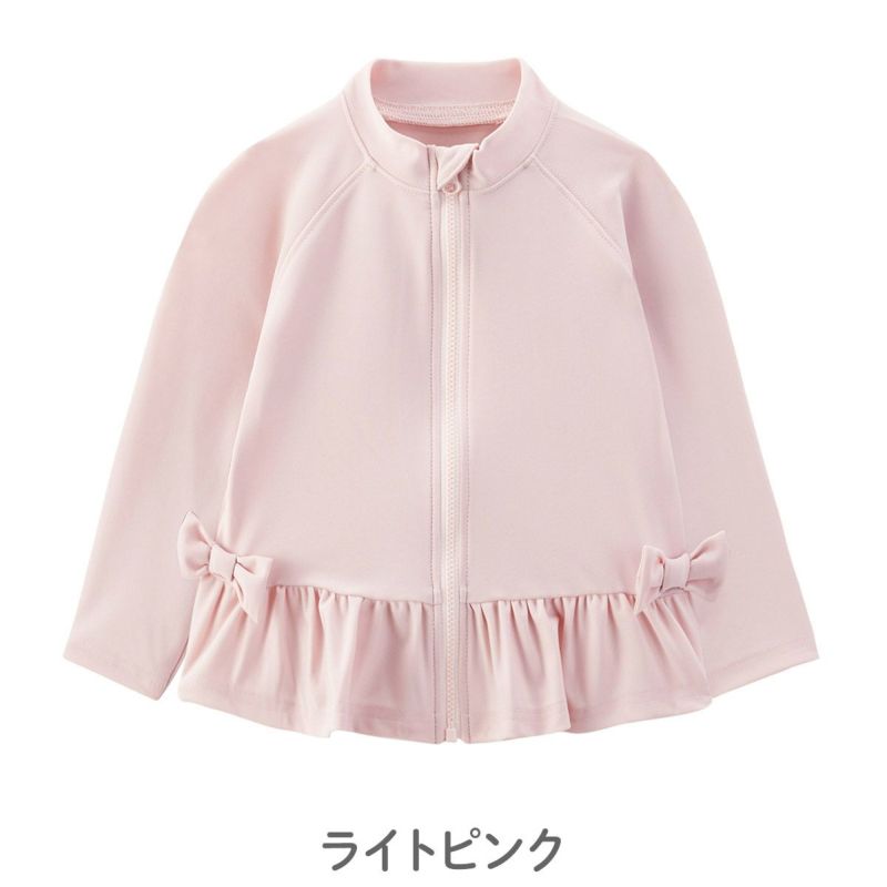 【仕様】裾部分のペプラムフリルや共布で作ったリボン飾りなど、主張しすぎないようにガーリーエッセンスを詰め込みました。プールやビーチでの水遊び着はもちろん、冷房対策などのデイリーアウターとしても重宝し、紫外線や身体の冷えから守るのに最適です。