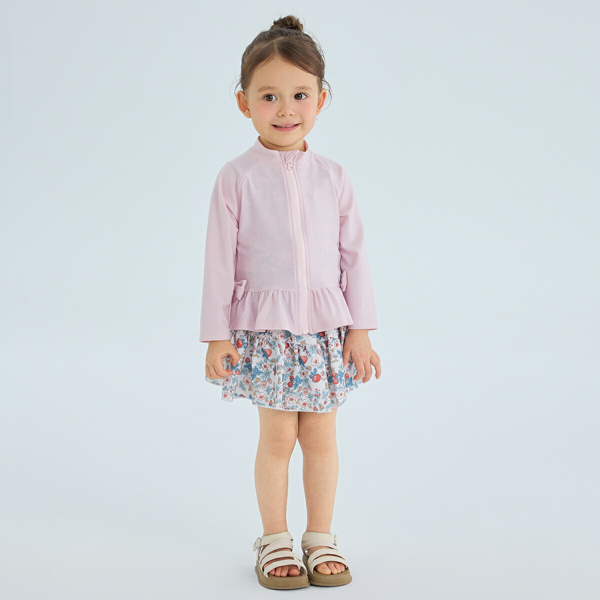 【仕様】裾部分のペプラムフリルや共布で作ったリボン飾りなど、主張しすぎないようにガーリーエッセンスを詰め込みました。プールやビーチでの水遊び着はもちろん、冷房対策などのデイリーアウターとしても重宝し、紫外線や身体の冷えから守るのに最適です。