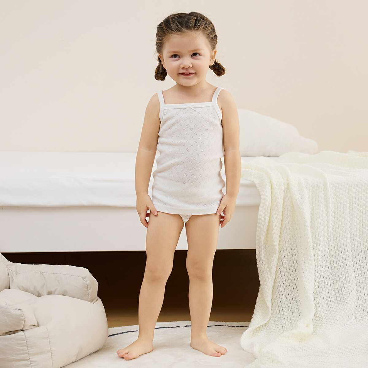 【素材】コンビミニの人気キャミソールは、無地見えなのにハート柄が入っている、伸縮性のある肌ざわりの良い綿100%アイレットフライスを使用。