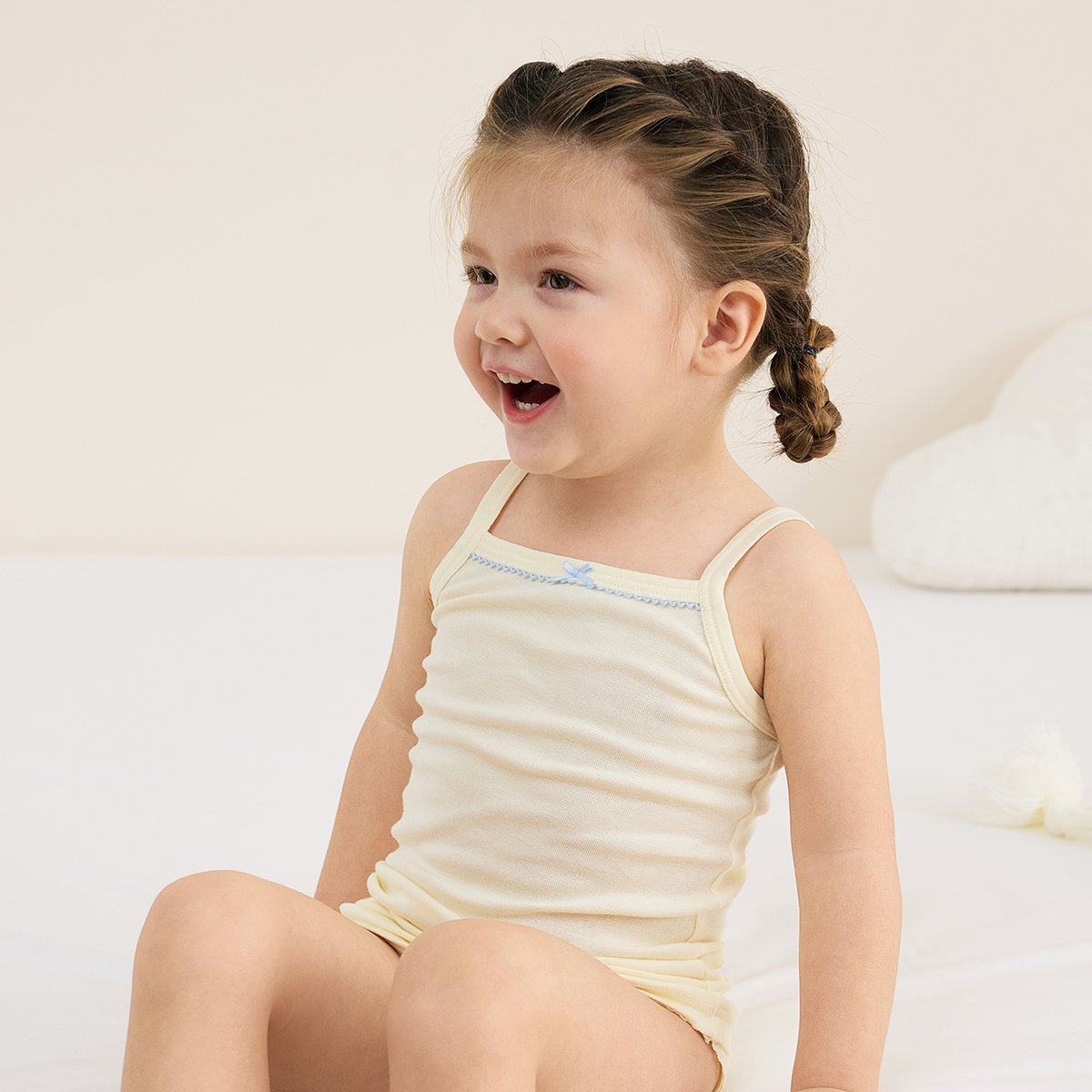 【仕様】胸元に配色のピコとリボンをあしらい、ガーリーに仕上げたキャミソールタイプの肌着です。