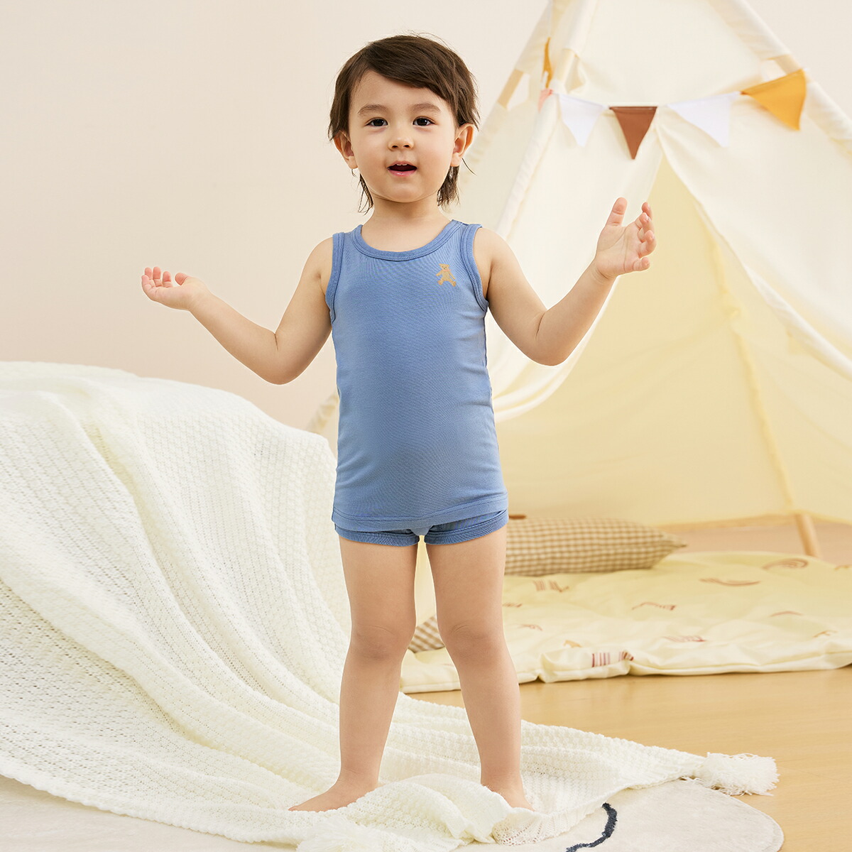 【仕様】男児がお部屋の中で1枚でも着やすいダークブルーとライトグリーンの2色をご用意しました。Tシャツやトレーナーの下に着てもゴワつかない設計で、胸部分には定番テディベアのワンポイントプリントが施されています。 【サイズ展開】新素材モダールタンクトップにも140cmをご用意いたしました、ぜひお試しくださいませ。