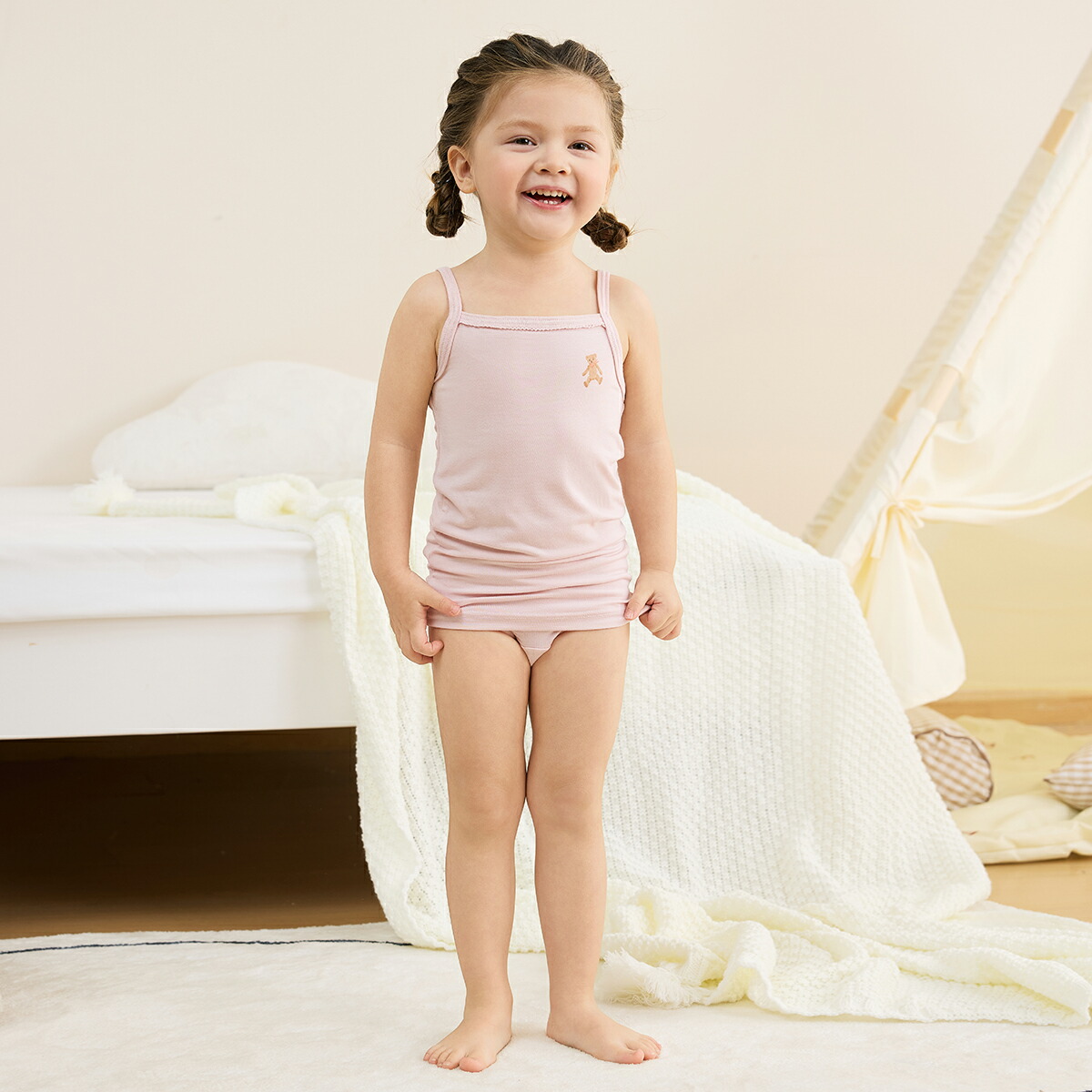 【仕様】女児に人気のあるライトピンクとラベンダーの2色をご用意しました。前身頃にはピコをあしらい、胸部分には定番テディベアのワンポイントプリントが施されています。Tシャツやトレーナーの下に着てもゴワつかない設計です。