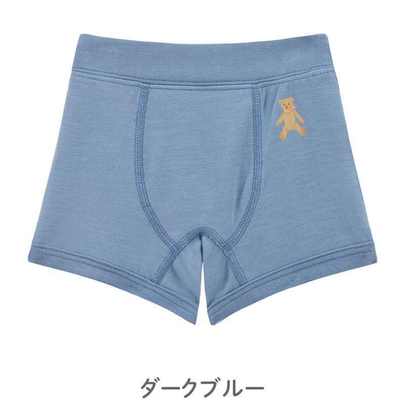 【仕様】男児に人気のあるダークブルーとライトグリーンの2色をご用意。肌に心地よくフィットする形を採用し、定番テディベアのワンポイントプリントを施しました。 【サイズ展開】新素材モダールボクサーパンツにも140cmをご用意いたしました、ぜひお試しくださいませ。