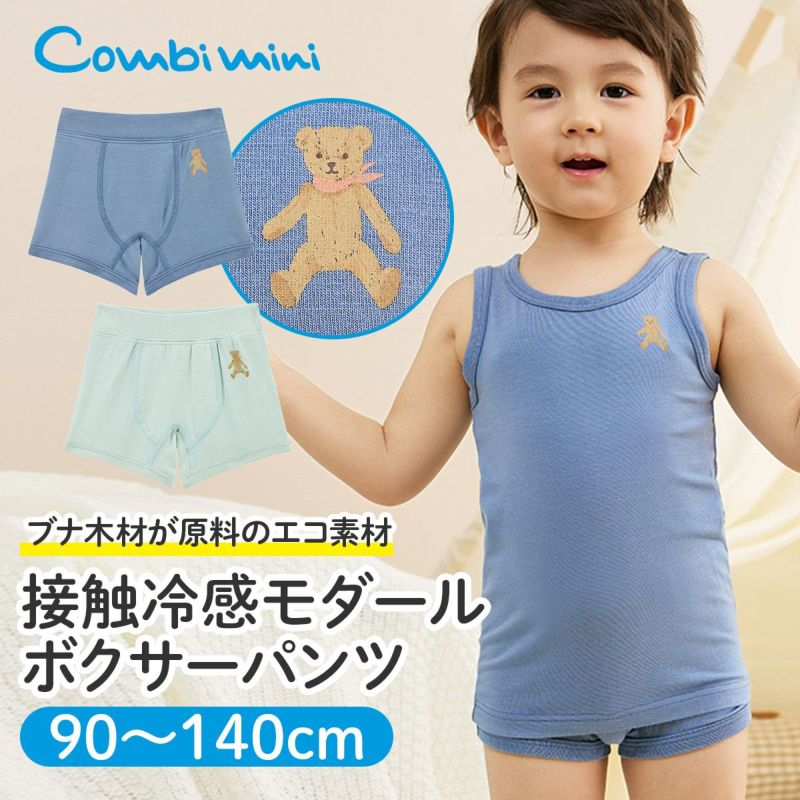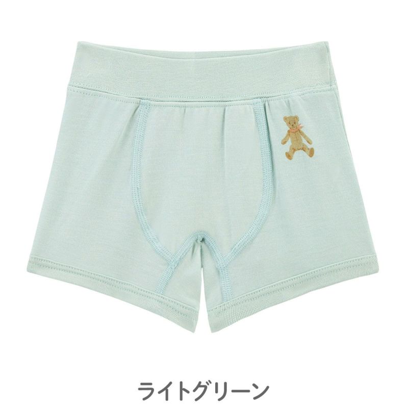 【仕様】男児に人気のあるダークブルーとライトグリーンの2色をご用意。肌に心地よくフィットする形を採用し、定番テディベアのワンポイントプリントを施しました。 【サイズ展開】新素材モダールボクサーパンツにも140cmをご用意いたしました、ぜひお試しくださいませ。
