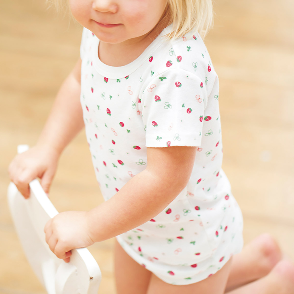 汗ばむ季節も心地よい肌ざわりを保つさらさら素材。イチゴの赤にクローバーの緑を効かせたお部屋着感覚でも着られるTシャツタイプです。