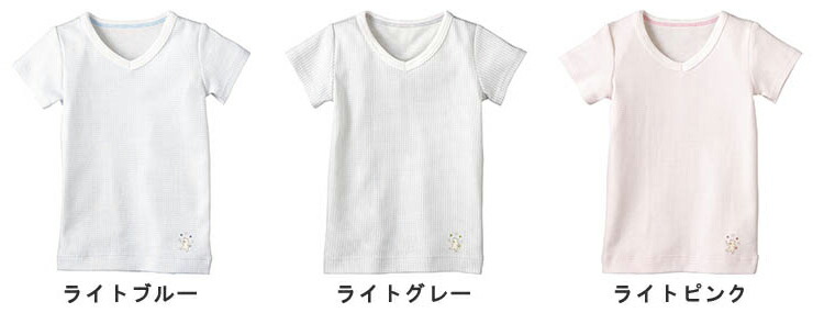 ピンチェックをプリントしたフライス素材にお手玉クマさんがキュートなポイント。通気性もあり伸びがよく、やさしい肌ざわりの半袖VネックT。首まわりがもたつかず、着脱もらくちん。