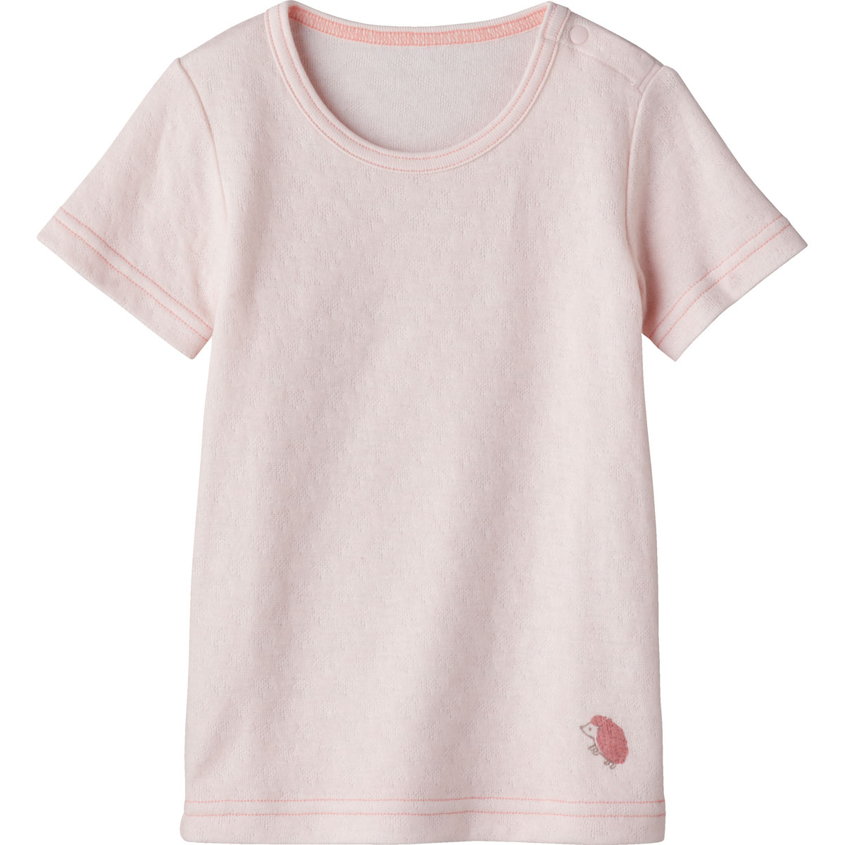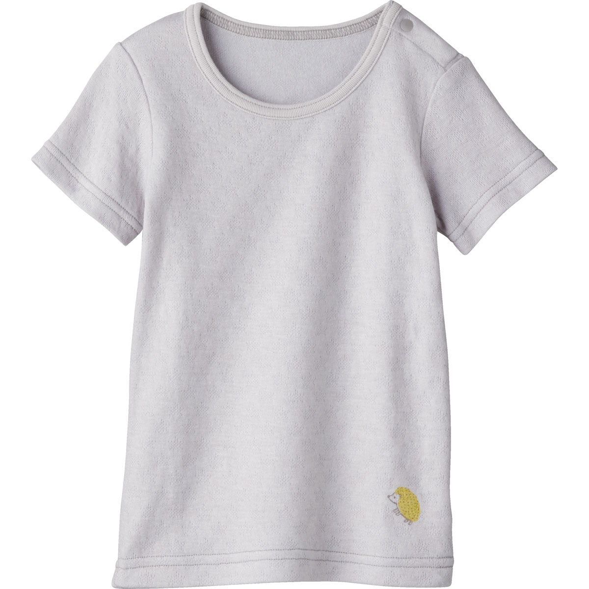 軽くてあたたかいアンゴラ混素材の半袖Tシャツ。吸水性がありむれずに気持ちよく着られます。インナーとして使いやすいシンプルなデザインとベーシックなカラー。ワンポイントのはりねずみもキュートです。