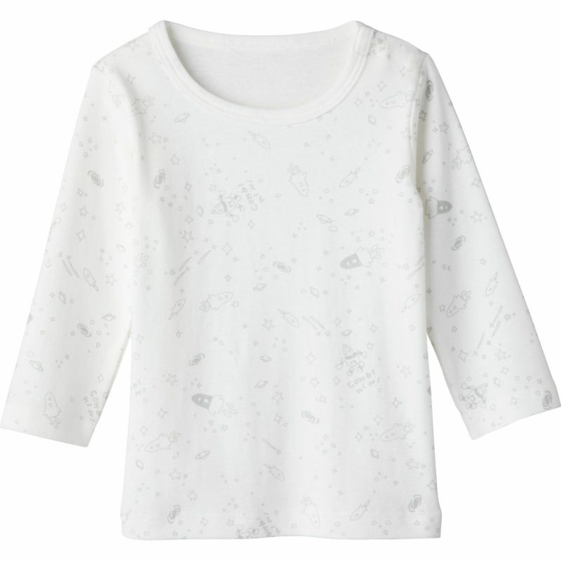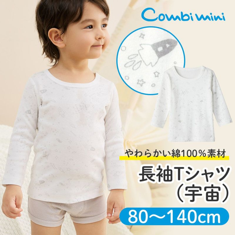 【柄】ロボットやロケットがプリントされたファンタジックな宇宙柄の長袖Tシャツ。日常的に使うインナーとして便利です。