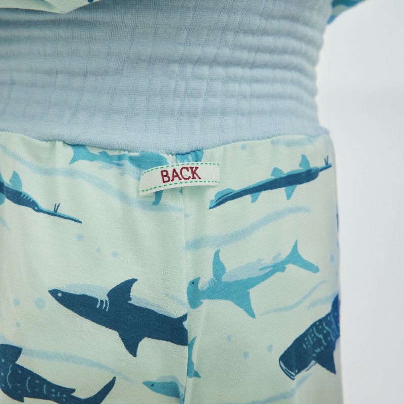 海の王者であるサメたちが気持ちよさそうに、ゆうゆうと泳ぐ姿は涼しげで、海の生き物が大好きなキッズにおすすめです。なめらかな薄手の綿素材は肌触りもよく、ボトムはおなかにやさしいシームレス腹巻き付きで寝冷えから守ります。