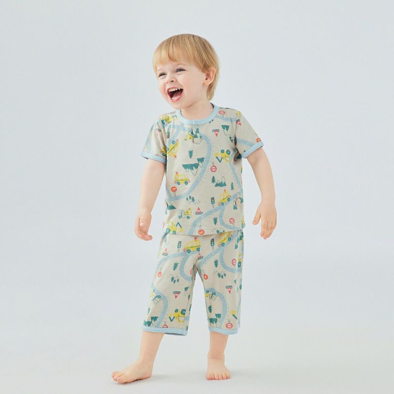キッズに大人気の働く車シリーズ。山で作業をするショベルカーたちが、迷路のような山道を走り回っている姿はワクワクした気持ちになりそう。グレージュの落ち着いた優しい色合いで、なめらかな薄手の綿素材なので、肌触りもよく心地よく寝られそう。トップスはボタンのないラクチン被りタイプでカンタンにお着替えできます。