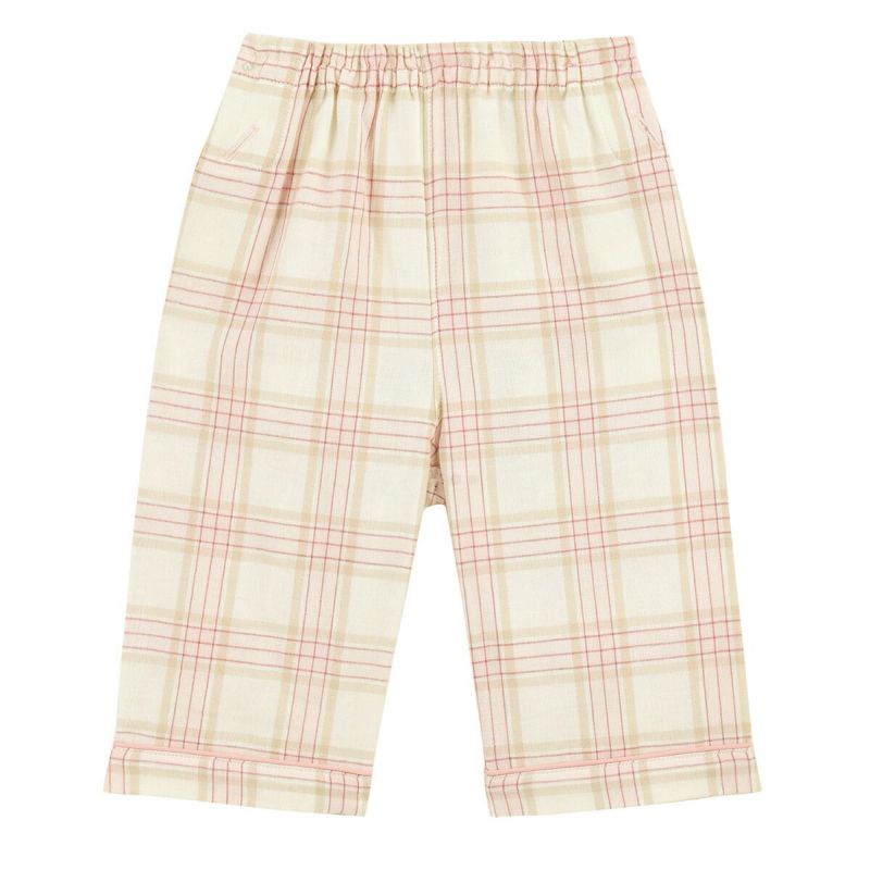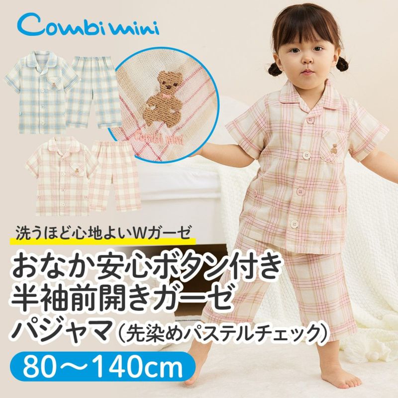 【柄】コンビミニ定番の先染めチェック柄が、春らしくやさしいパステルカラーで登場。男女ともにおススメの、ピンクとサックスカラーの2色展開で、同素材同柄の長袖もご用意してます。シーズン問わずママや兄弟姉妹とのお揃いが楽しめます。(長袖ママパジャマ656255/長袖品番656253/半袖ママパジャマ657255)