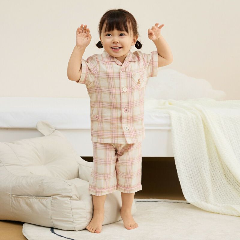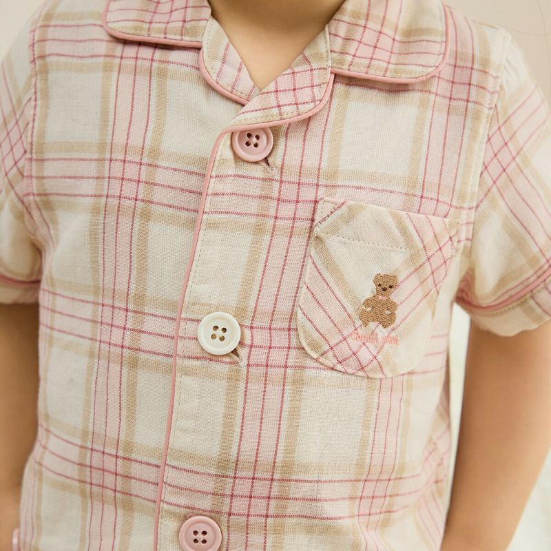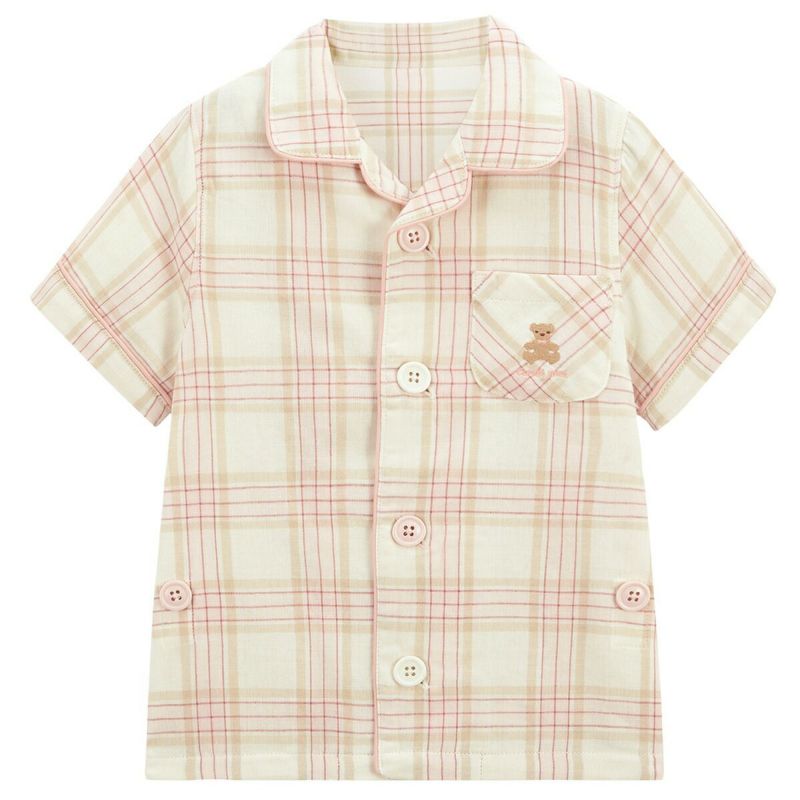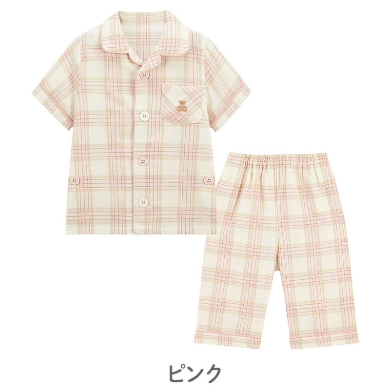 おなか安心ボタン付き半袖前開きガーゼパジャマ(先染めパステルチェック)