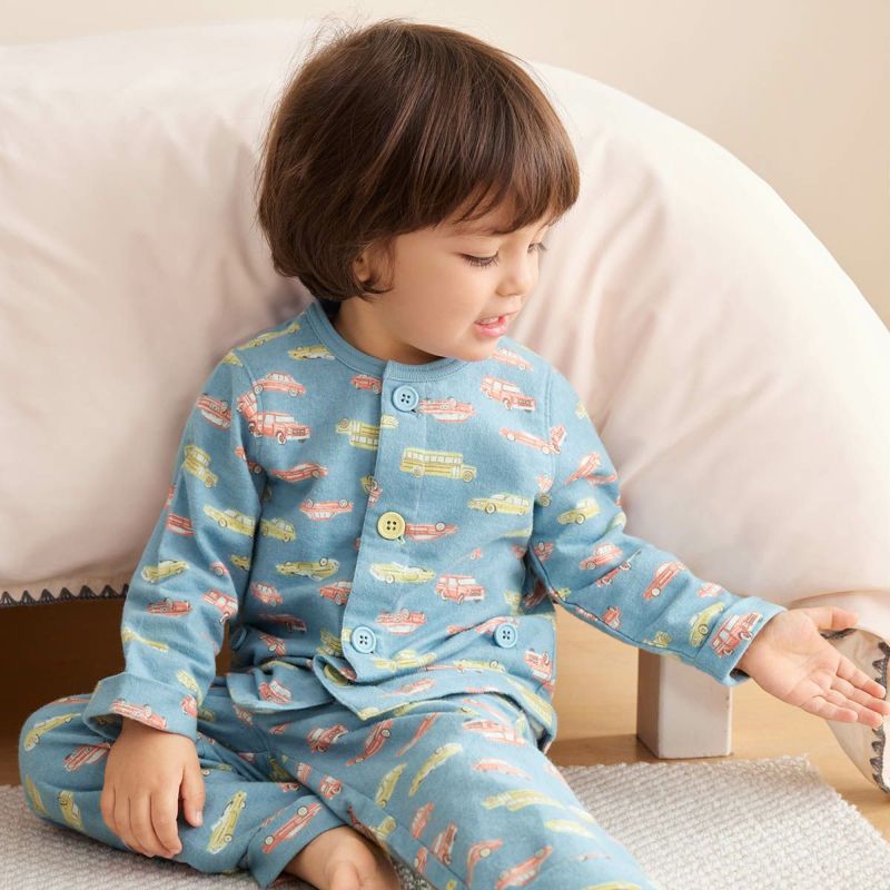 【仕様】首回りをすっきりさせたクルーネックタイプ。かけ違いを防ぐ配色ボタン&ホール仕様に加え、ボタンホールを斜めにしてボタンをとめやすくしたので、お着替えレッスンにもおすすめです。トップスがめくれておなかが冷えることを防ぐおなか安心ボタン付き。( ウエストゴム替え口付き )袖口と足口部分はステッチを外して着丈を伸ばせるアジャスト仕様。成長に合わせて長く愛用できます。
