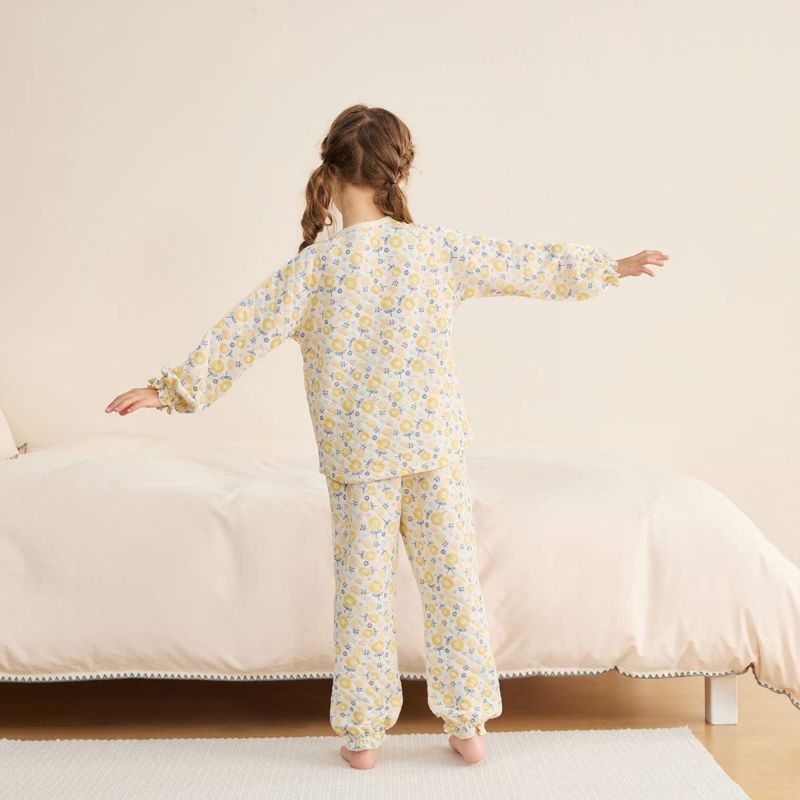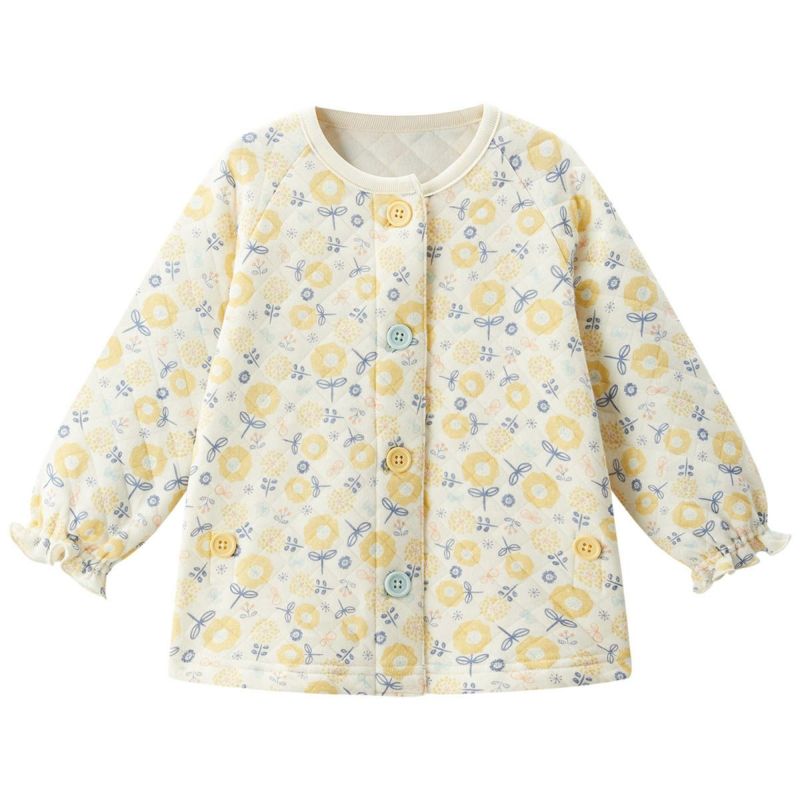 【柄】北欧風の黄色いキュートなお花が特徴の柄は着ているだけで幸せな気分になります。王道のピンクとは違うオシャレなイエローカラーで、いつもと異なる雰囲気をお楽しみください。同柄であったかニットキルトスリーパーやラップクラッチもあるのでベビー&キッズのおそろいで楽しめます。(新生児ラップクラッチ同柄品番: