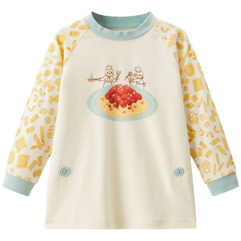 【柄】アイボリー:ねこコックや星などの色々な形状のショートパスタの総柄に、トップス前身頃には、ねこコックが作るミートボールパスタのプリントを大きく施しました。いますぐ食べたくなるような可愛らしいイラストは男女ともにおススメです。ライトイエロー:キッズに人気の恐竜シリーズ。ヴェロキラプトル、アンキロサウルス、ディメトロドンなどの恐竜たちを明るいトーンで表現しました。ベースカラーもやさしい色合いで女の子にも是非おススメしたい柄です。