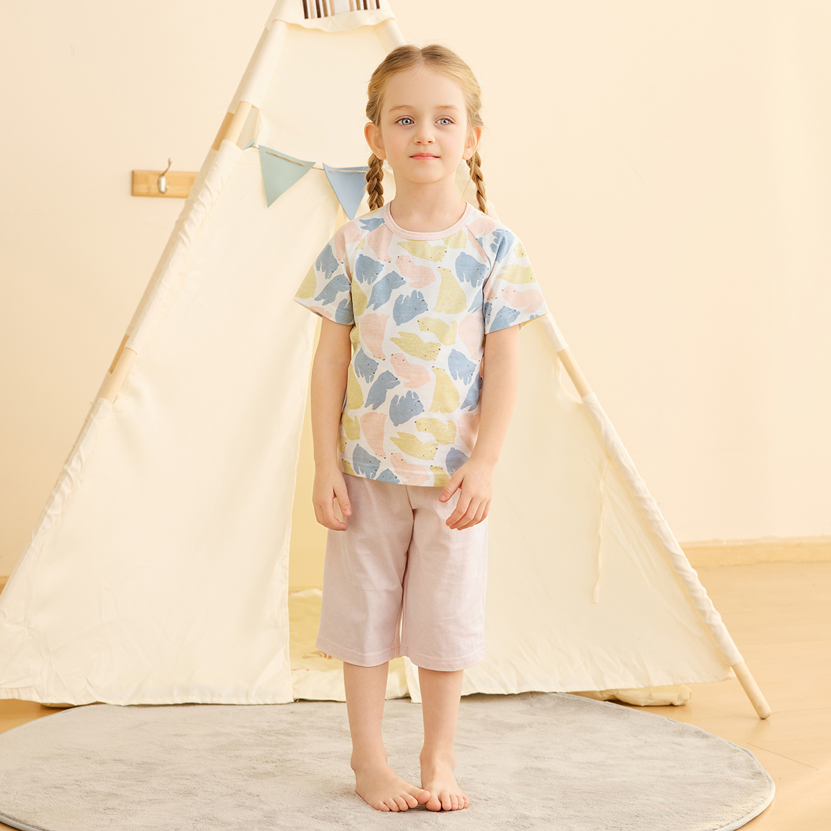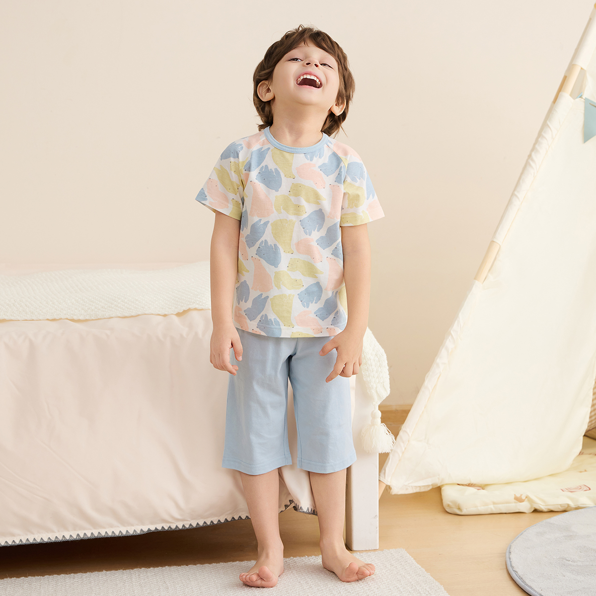 【柄】やさしいニュアンスカラーのくまたちがさまざまなポーズを取ったほんわかとする総柄に、ピンクとサックスのカラーパンツを合わせた男女ともにおススメのパジャマです。