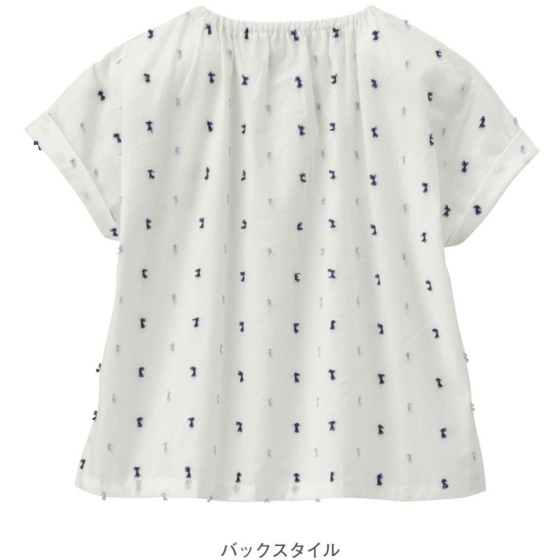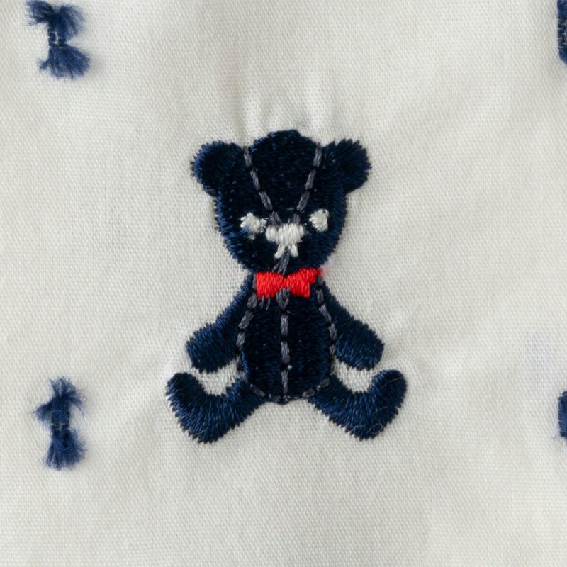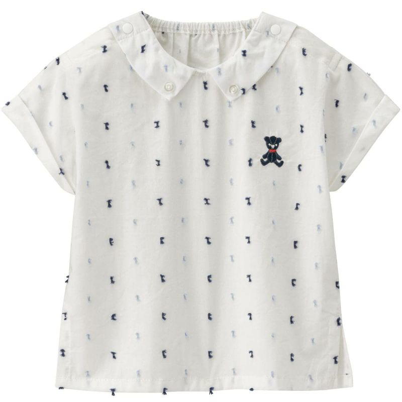 上質なオリジナルの先染めカットドビー生地を使用した、おめかし仕様トップス。立体的な水色と紺色のドビードットがさわやかで、男女ともにおすすめです。前身頃の襟には飾りボタンをあしらい、左胸にはくまの刺しゅうを入れてワンポイントに。両肩開き&後ろ襟ゴム仕様でお着替えをサポートします。同生地の新生児アイテム(品番:236750、336250)やキッズアイテム(品番:536155)とのリンクコーデも楽しめます。