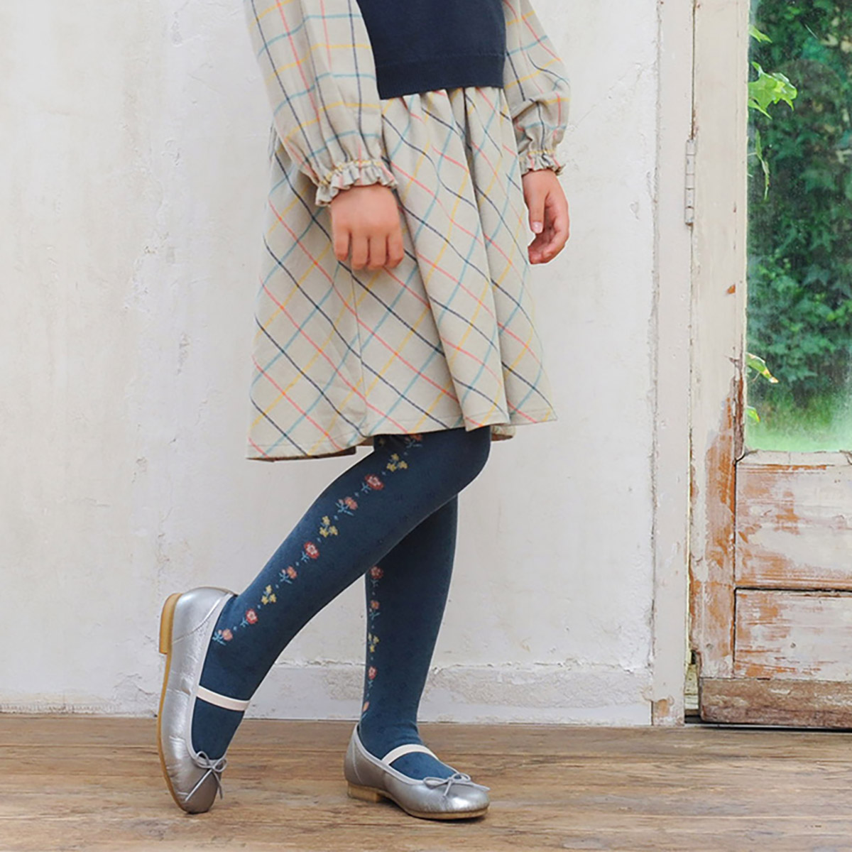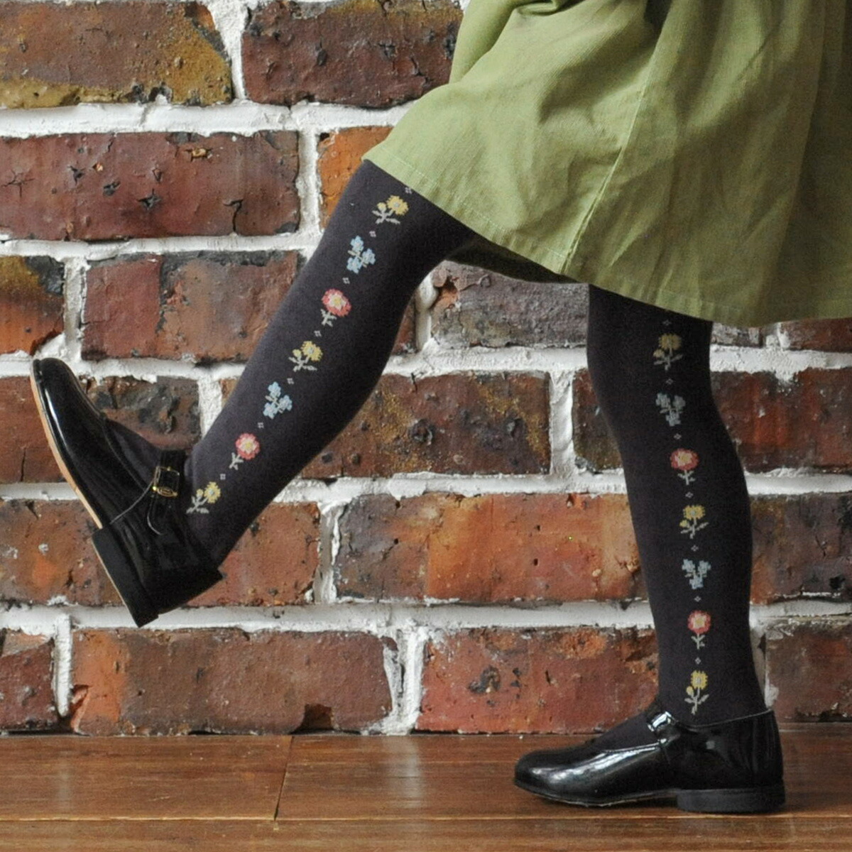 ダイヤ柄の透かし編みがキュートなタイツ。サイドにあしらった、色とりどりの花模様ラインがおしゃれなポイント。渋めのベースカラーで、かわいいけれど甘くなりすぎないクラシカルなコーデを演出できます。