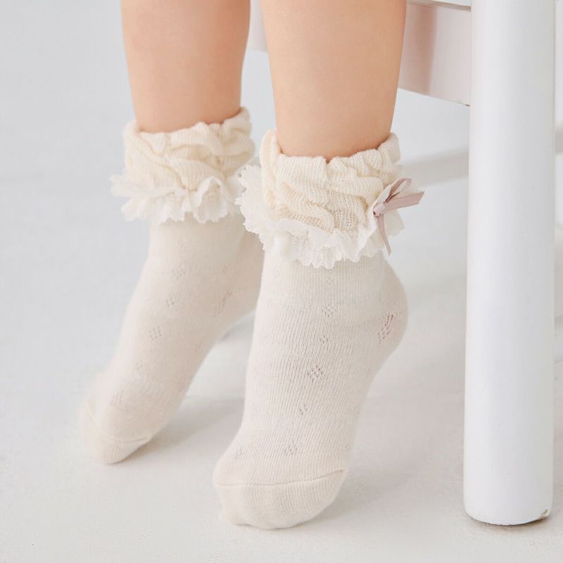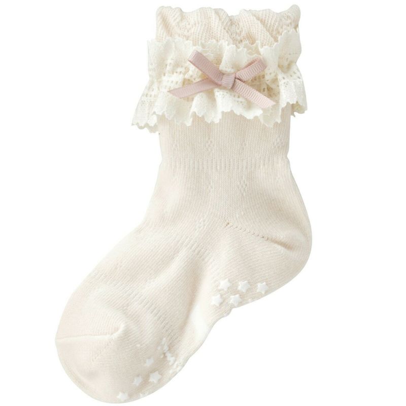 【仕様】上部にふっくらギャザーを寄せたような編地にレース&リボンを重ねた、エレガントなソックスです。つま先&かかとの厚手仕様で長く愛用出来る機能がいっぱい。