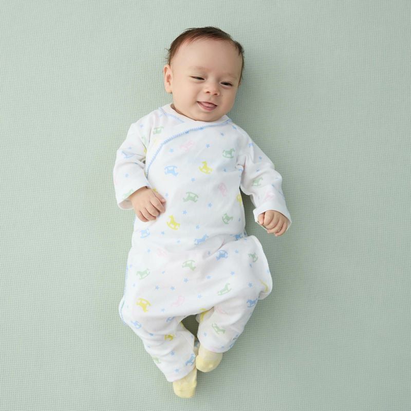 【仕様】着くずれしにくいパンツ型ウェアはチャイルドシートなどのベルトもスッキリ留めやすい!ワンタッチテープの仕様でサッとお着替え出来るので、おむつ替えがカンタン。ワンタッチ短肌着を入れて重ねてお着替えすれば、さらにカンタン!忙しい毎日でも赤ちゃんとの時間が長く取れるようにおむつ替えが時間短縮で赤ちゃんもママも笑顔に。