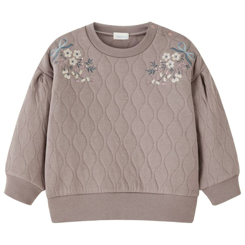 【柄】ベースのあったか素材はひょうたん柄が特徴で、両肩にはブーケをイメージした花の刺繍を施しキレイでかわいい印象のトップスに仕上げました。
