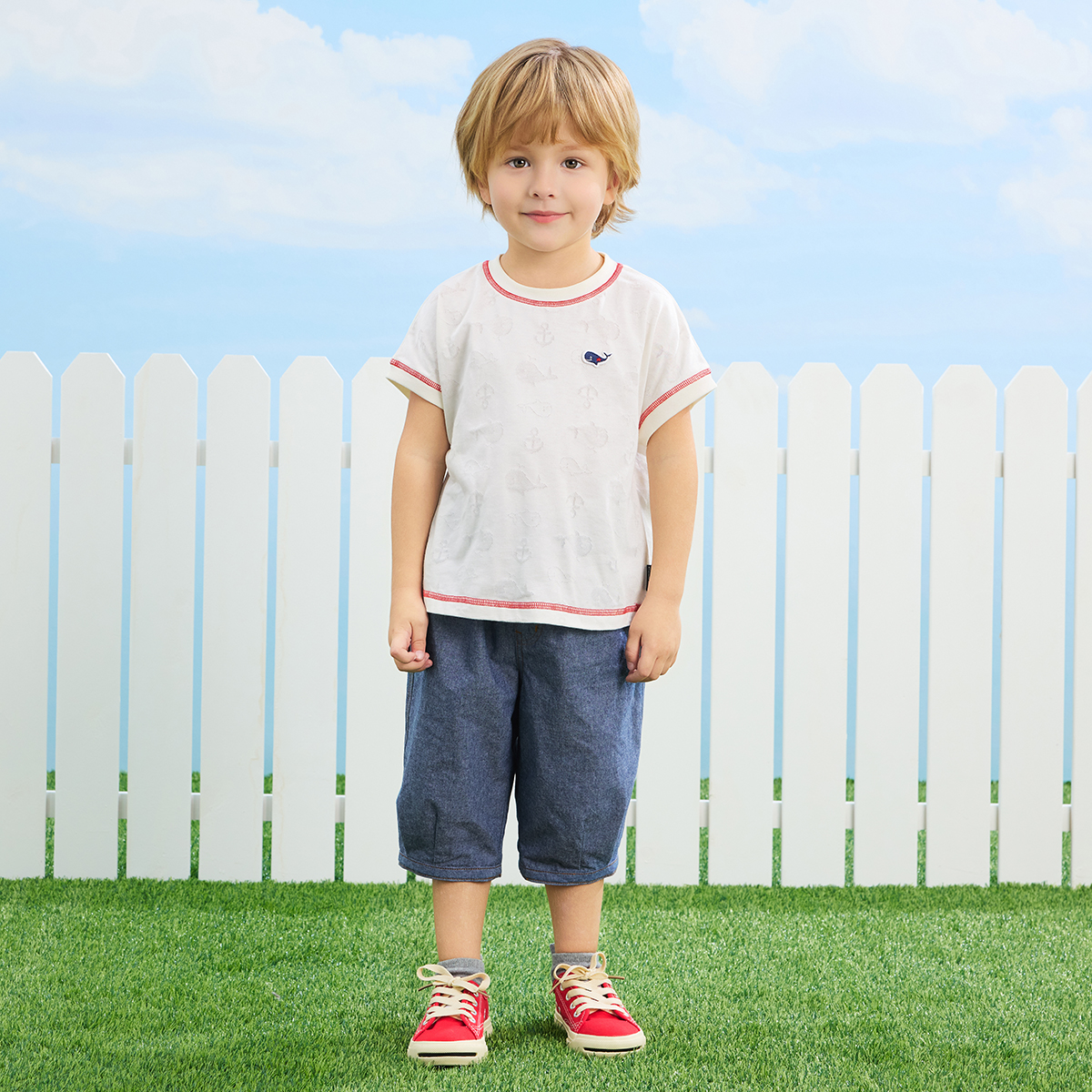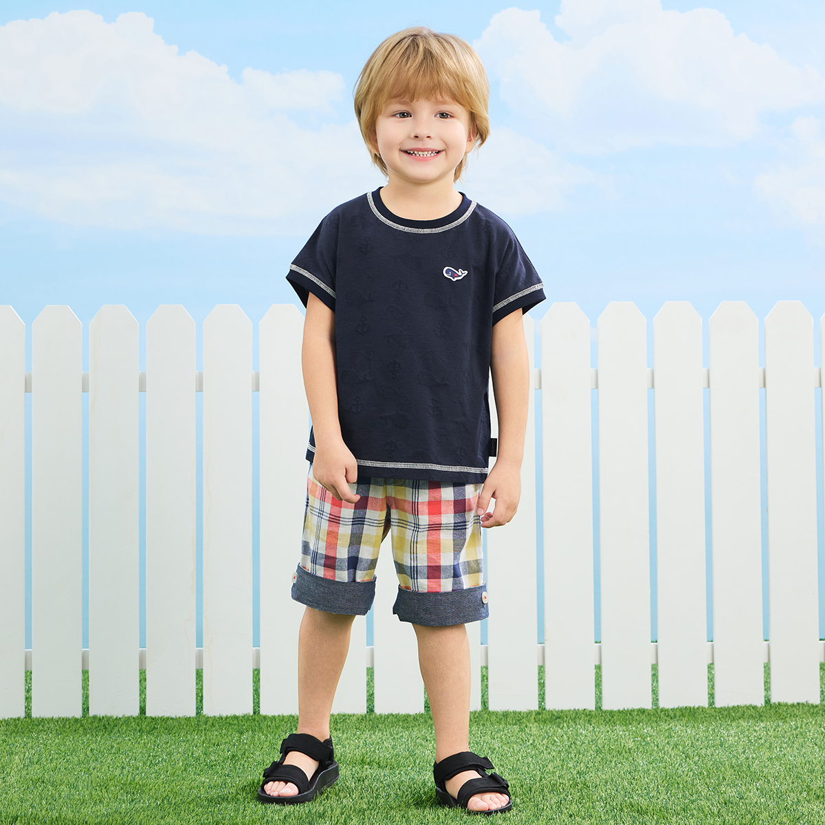 【素材】コンビミニオリジナルのジャカード素材、夏を感じるくじらとアンカーのさわやかなマリンテイストの柄。柄部分はメッシュ素材で通気性に優れ、暑い夏でも快適で涼し気な生地感が特長です。