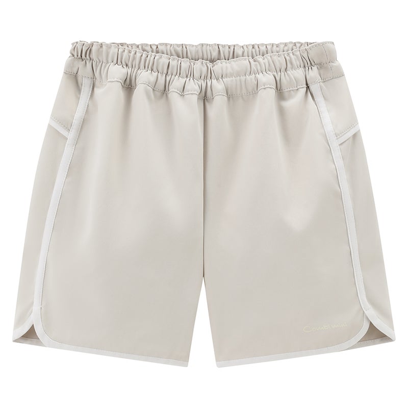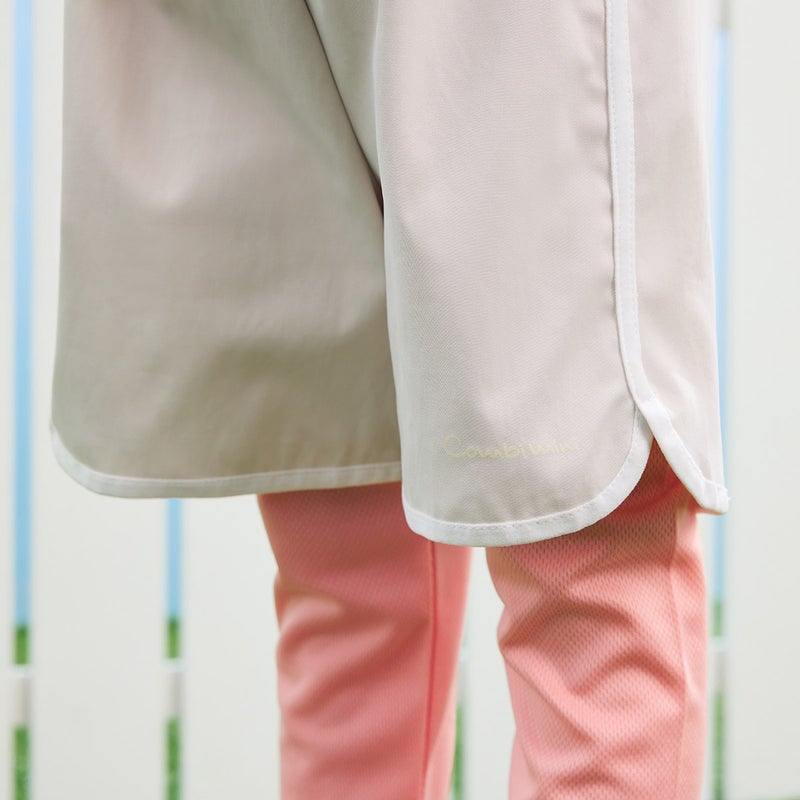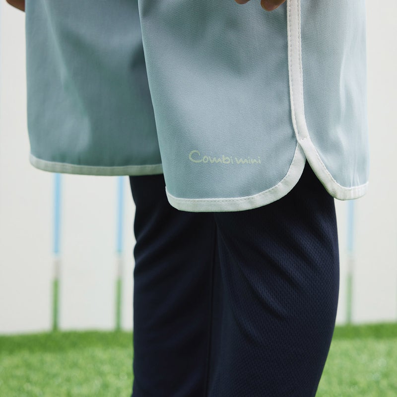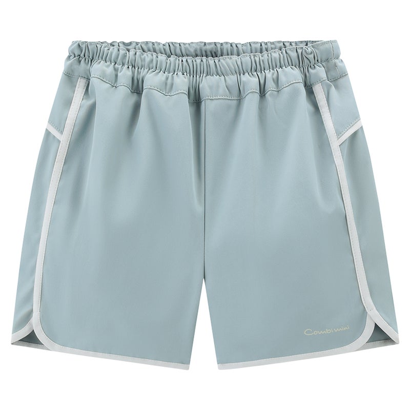【柄】スポーティなデザインながらやさしい色合いでサイドやバッグの配色ラインが特徴のパイピングショーツ。左足側にはコンビミニロゴのプリントをワンポイントデザインで加えました。